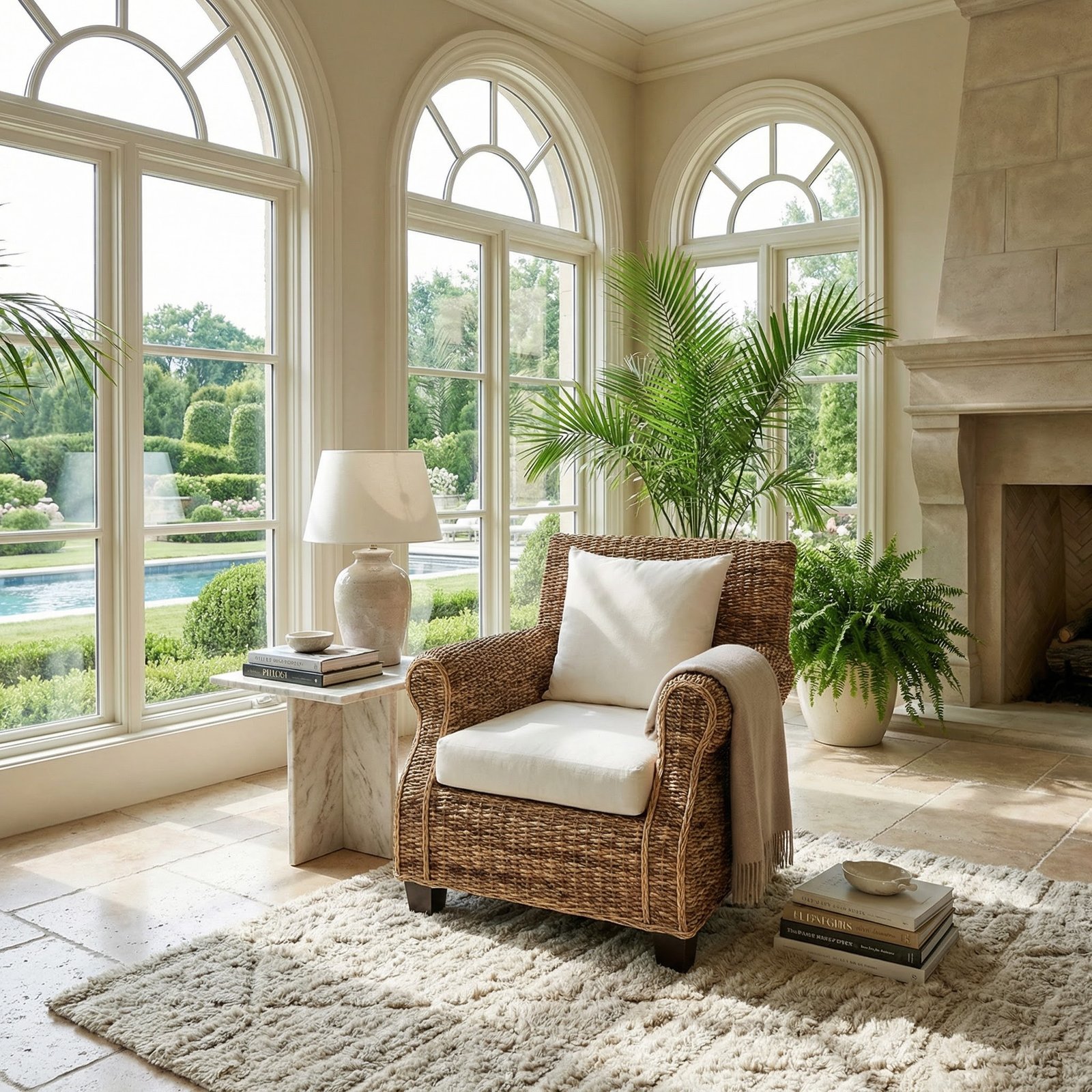 This natural organic Chair is from the Cabana Grand Collection. Special attention was paid to making this Chair extra comfortable and also more spacious ; collection features thicker arms and a larger overall scale used in the design and manufacturing. Measuring 37.00 x 35.50 x 43.25 Inches. Sold Separately, This chair can also be matched with other items from the Cabana Grand Collection to complete an entire project or room. Hand Made over solid mahogany framed. Hand Woven using the strongest Water Hyacinth Natural Weave. Beautiful natural finish pairs with the neutral fabrics used. Minor Assembly of legs may be required. This Collection is only for covered spaces and not suitable for exposure to outdoor weather for long periods of time. Imported from Indonesia and exclusively manufactured for the AFD Home Collection.