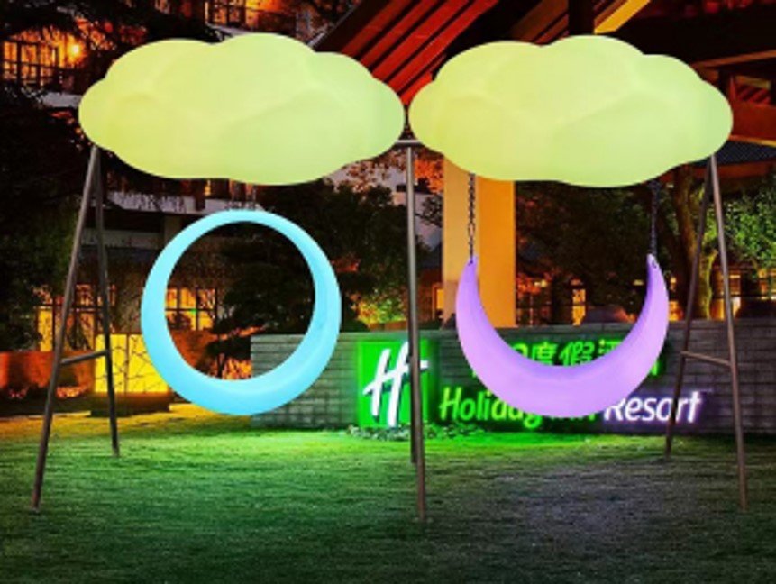 Step into a world of whimsy and wonder with the Celestial Swing Set, an enchanting addition to any backyard or nightlife venue. With overall dimensions of 157.5 inches in width, 65.5 inches in depth, and 115 inches in height, this set of two swings offers an ethereal escape and the ultimate selfie backdrop. The first swing cradles you in the comfort of a cloud. Soft, glowing, and exuding serenity, it is a haven designed to elevate you above the ordinary. Its counterpart, the crescent moon swing, bathes you in a gentle luminescence, capturing the mystique of moonlit nights and providing a surreal floating experience. Not only does this set promise a magical retreat, but it also serves as an exquisite decorative element. Its distinct silhouette stands out against the night sky or a bustling club scene, inviting guests to immerse themselves in a celestial playground. This swing set is more than a piece of outdoor furniture or a nightclub attraction; it’s a conversation piece, a photo opportunity, and a memorable experience rolled into one. Whether it’s enjoyed in the quiet of your backyard or the vibrant atmosphere of a night on the town, the Celestial Swing Set is where memories are made and shared.