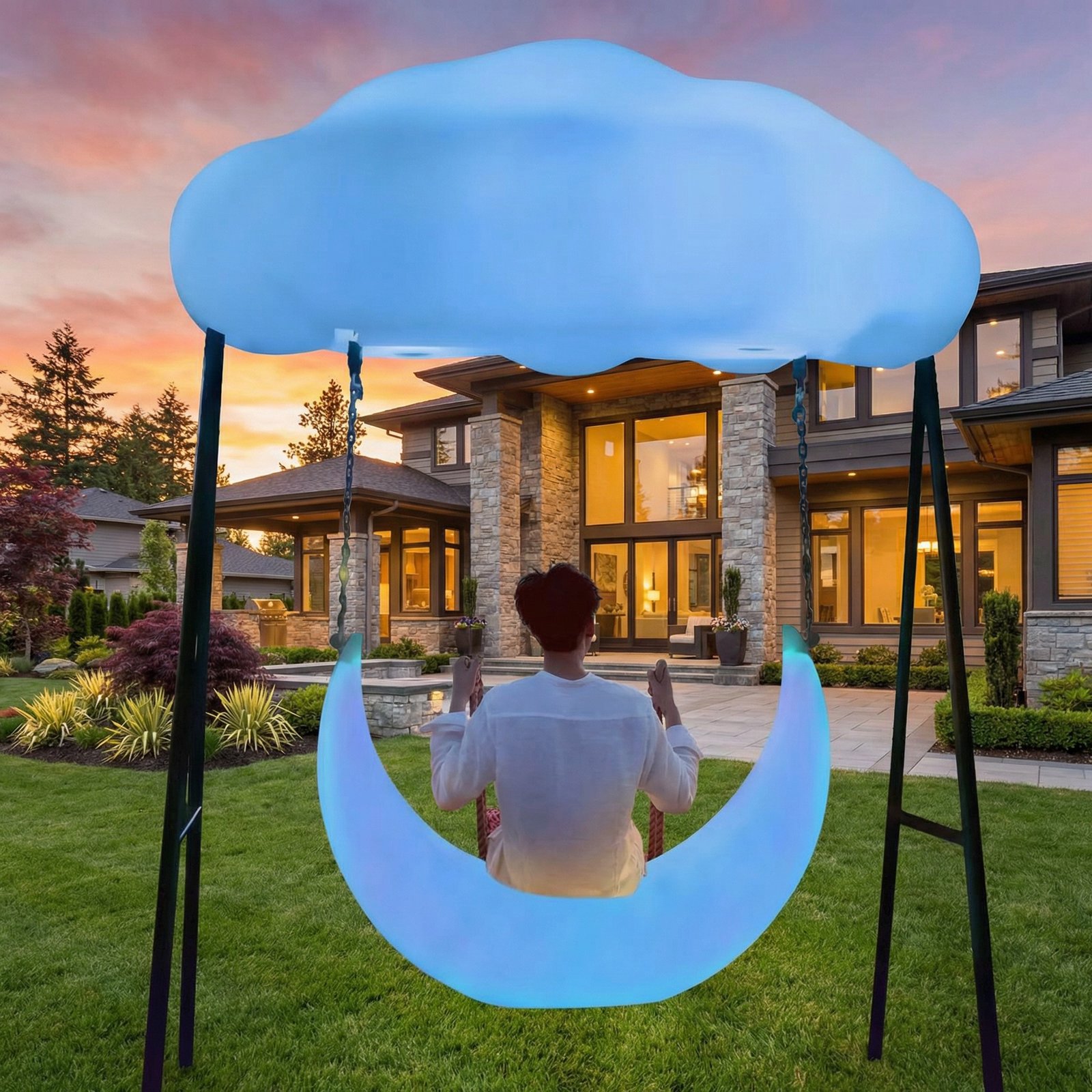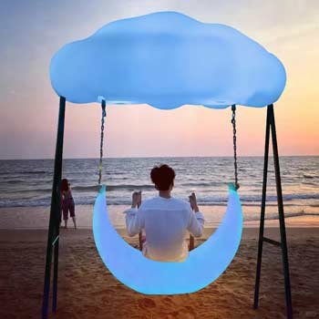 Bring a touch of magic to your outdoor space with our LED Color Changing Moon and Cloud Swing. Inspired by the serenity of the night sky, this beautifully illuminated swing features a glowing crescent moon seat suspended beneath a luminous cloud canopy. Perfect for beachside lounges, backyard escapes, or event decor, it transforms any setting into a dreamy retreat.Turn your evenings into a moonlit escape — where every swing feels like floating through the clouds.