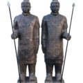 The left and right life size pair of standing terra cotta warriors 78.74″ tall w black earthy finish. These impressive sculptures are individually hand cast and hand finished in a durable fiberglass and cast stone reinforced material. The black earthy finish is durable and offers an authentic antique quality and richness. These recreations of todays’ famous terracotta army depict the bravest and most loyal of soldiers from the guards of qin shi huang, the first emperor of China and creator of the qin dynasty. It is said qin, in order to have the same military power and protection in the after life, was buried with 1000’s of these soldiers in 210–209 bce who for centuries to come protected the emperor buried, the tomb was discovered in the 1970’s by a farmer. These impressive life sized sculptures are suitable for outdoor or indoor use and could be displayed proudly as a symmetrical entry guards. The set of 2 arrives individually crated and completely assembled with Chinese spears of war mounted in each warriors raised hands.