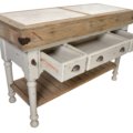 - This is a perfect marble top kitchen island that is great for small spaces not quite large enough for formal kitchen islands. Also great for additional work space in a large kitchen this is a beautiful farmhouse style piece with enhanced finishing and bench made construction.