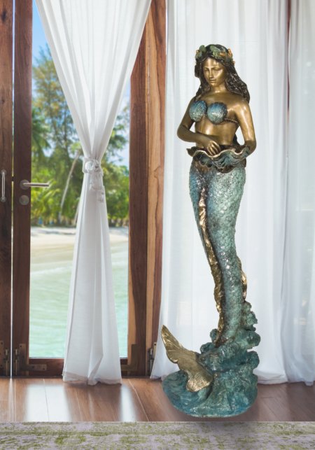 A beautiful Mermaid Holding Shell Sculpture Fountain Feature measuring 30 inches wide X 21 inches Deep x 71 inches tall. Mythical Mermaids have captured the hearts and imaginations for ages. This fabulous Maiden of the Sea stands upright, holding a large shell. This beautiful standalone decorative sculpture has also been plumbed with copper tubing. If desired, it could be connected to a water source to create a functioning water feature by allowing water to flow out of the shell and down into a pool, basin, or surround. The sculpture features a gallery quality Enamel, Polychrome Finishing that captures the magical beauty and vibrant colors of our underwater world. Ocean enthusiasts love this entire and expansive collection from The Timeless Creations Collections, a division of AFD Home. It is 100 percent Lost Wax Cast Bronze. It is a major original work of art that is Functional, Decorative as well as a collectible. Quality pieces of this nature last forever and can be grouped with other offerings available to create an entire Marine display. Hand Cast and Hand Finished in Thailand by skilled foundry Artists. No Assembly Required unless being used as a water feature.