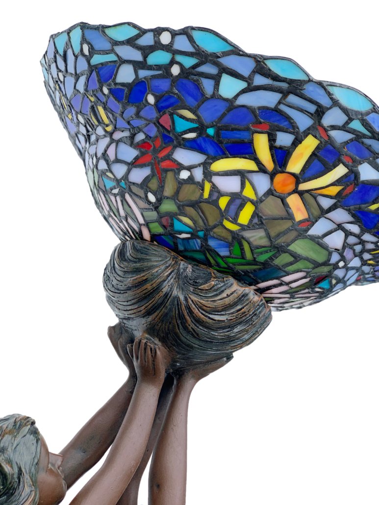 A very beautiful and unique self contained Illuminated Mermaid Fountain standing 73 Inches Tall. The item has an Italian bronze style of finishing. It is hand cast in durable all weather Fiberglass for long lasting use. The light has an intricate leaded glass stain glass shade. Lights and fountain pump are provided and operate with standard 110 v power. The Fountain Creation comes in 3 pieces and very Minor assembly is required. Regular bulb for lamp is not provided.