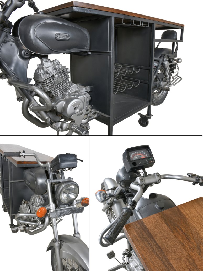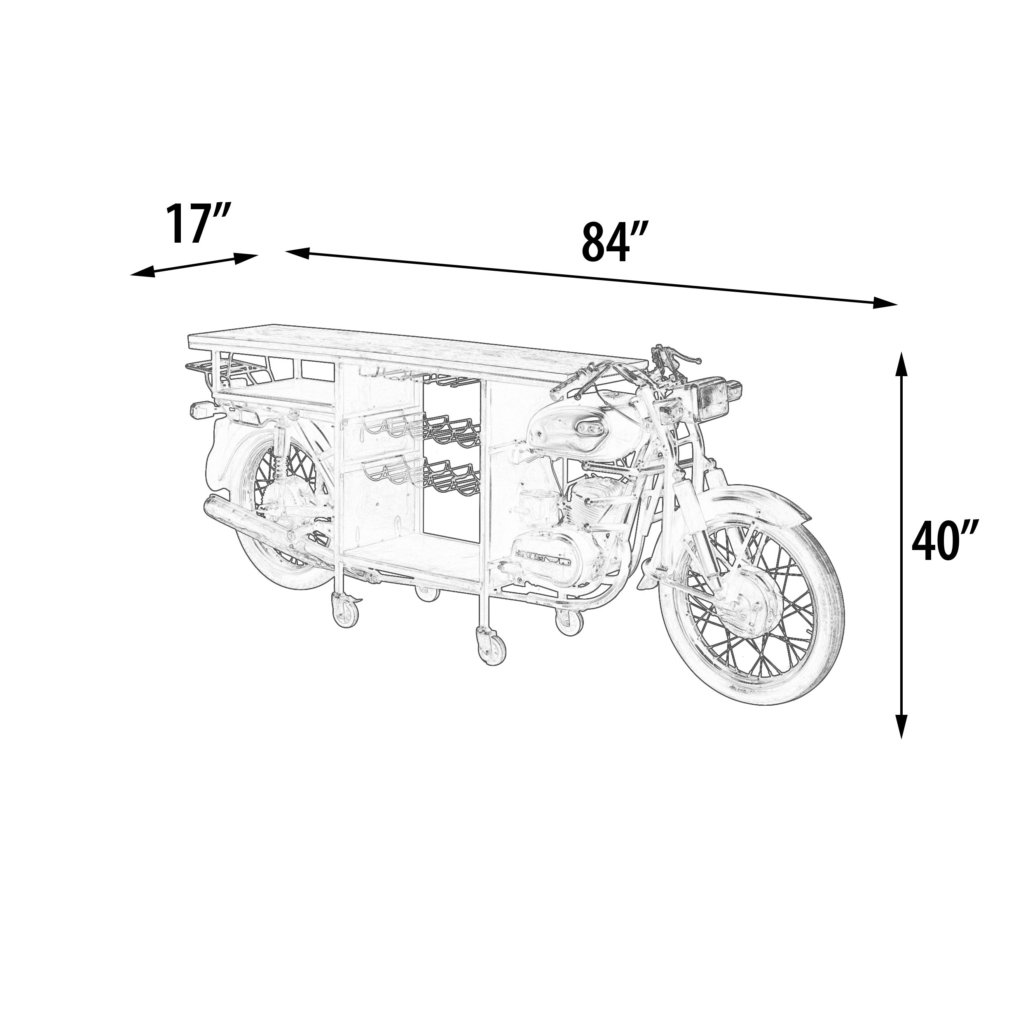 - Mountain Blacksmith Authentic Motorcycle Bar Counter Vintage 80 Inches An Awesome and Unique Find! An Authentic Vintage Motorcycle that has been re-purposed into a Wine Bar and Counter. The Motorcycle Counter Bar is mounted on an Iron stand for secure placement. This design works well for any Bike Enthusiast and styled to be special in any American Farmhouse, Coastal, Urban, Industrial and/or Rustic Interiors. Authentically Hand Created by our skilled Blacksmiths using Old re-purposed Motorcycles. These bikes have lots of History and Stories to Tell after being salvaged by our Pickers from the busy day to day traffic, that they each were a part of, from the busy streets of Rajasthan India. Original and Imported from India. Constructed from steel, iron, rubber and hardwoods. Like these unique type hand made items from the Mountain Blacksmith Collection of AFD Home then check out all the cool options for your fun room or business. No Assembly Required, Enjoy!