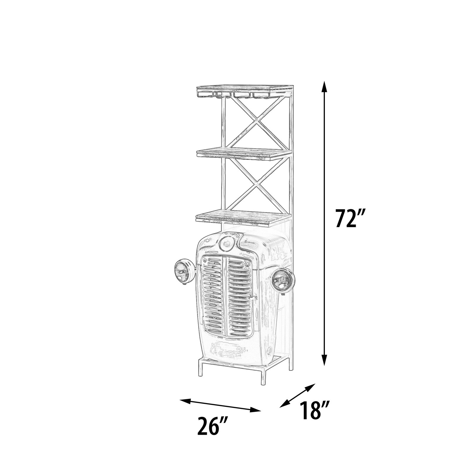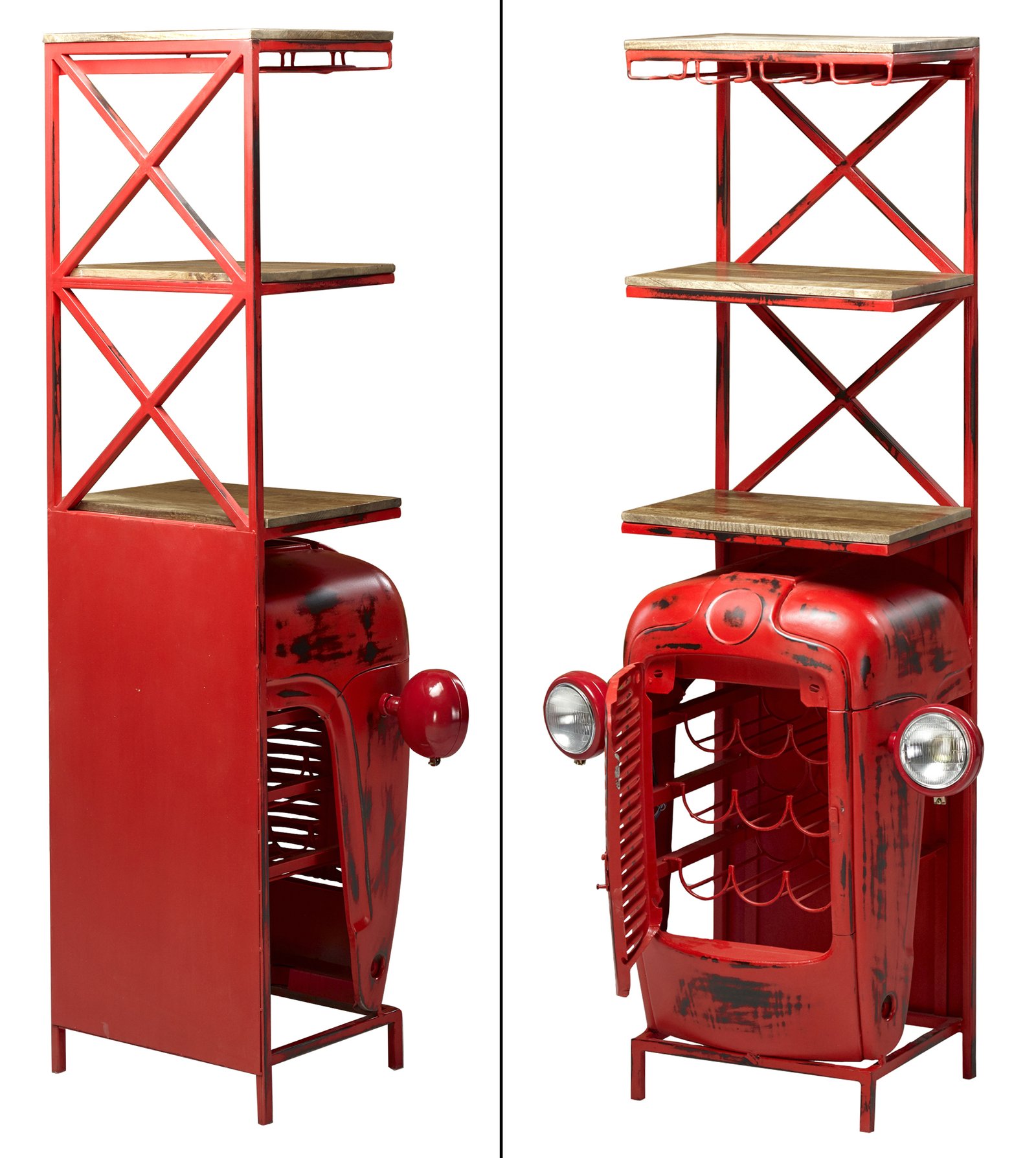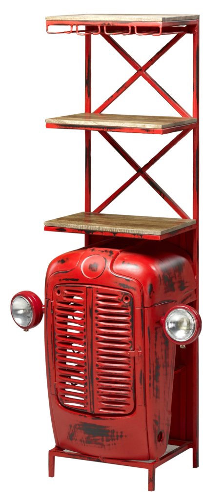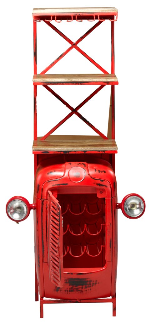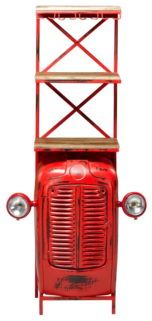 Mountain Blacksmith Authentic Tractor Bar Cabinet Vintage Red 72 Inch Tall. A Recognizable, Fun and Unique Offering. Tractor Bar arrives custom fitted with Todays Wine Bar Functions. While a perfect item for any American Farmhouse designed interior. This Tractor bar design works well in Coastal, Urban, Industrial and/or Rustic Interiors also. Authentically Hand Created by our skilled Blacksmiths using Old re-purposed Tractors. The Tractor Doors open for storage for bottles storage and assorted bar stuff. Hand Made and Imported from India. Constructed of Steel, Iron and Hardwood. Like these unique type hand made items from the Mountain Blacksmith Collection of AFD Home then check out all the cool options for your fun room or business. No Assembly Required, Enjoy!