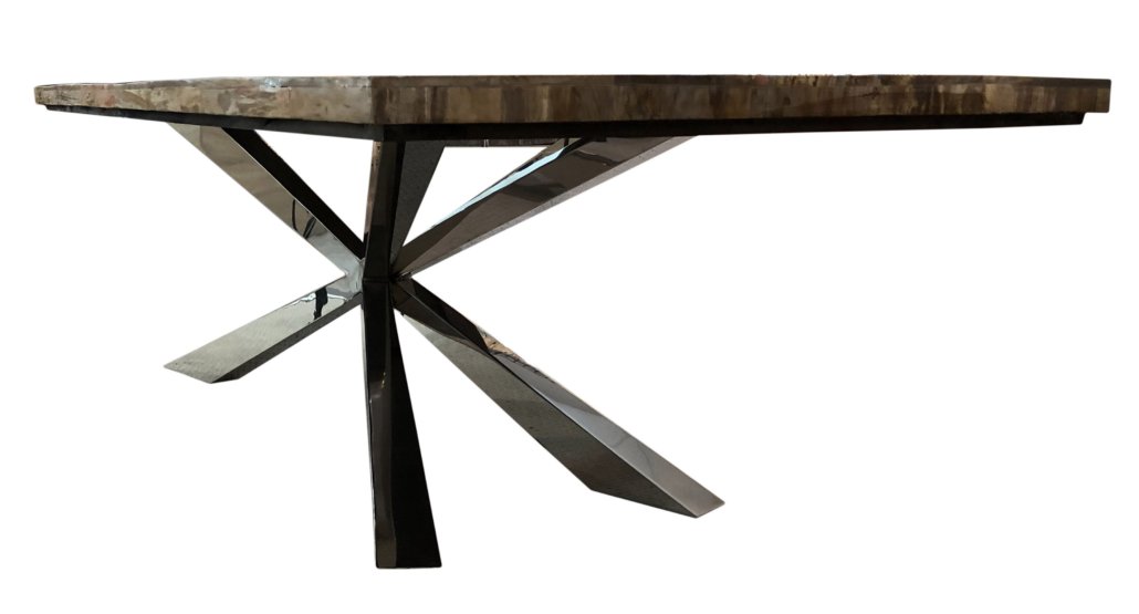 A very special exclusive Find! Presenting from the Mountain Studio Design Collection this Spectacular Dining, Conference Table, Authentic Specimen, Fossil, Stone. Petrified wood specimens are wood that has been fossilized into a stone over Millenniums. The local craftspeople seek these valuable Petrified Wood Specimens to create this Authentic Petrified wood Table Art for us, in sizes that make these precious Fossil Table functional for Todays finest Interiors. Whether a striking Dining table or a uniquely modern Conference Table, Petrified wood table tops are very strong with their stone like characteristics and are ready for use. The creation of these tables starts by finding the fossil pieces which are organized then sliced to workable sizes. Artists arrange and set the specimens onto a Plywood substrate for support, creating this one of a kind authentic Petrified Wood Stone table top. The base is also original and combines the skills of Mountain Blacksmiths as they created the artistic designed Stainless Steel Base. Understanding Petrified Wood 1) Specimens age ranges from a young 50, 000 to over million year old 2) Our specimens are found underground in the remote forests of Indonesia 3) When wood is covered by soil over the Millenniums the covered wood becomes deprived of oxygen and all rotting and detreating stops, slowly the wood pores absorb the minerals from water and massive fallen trunks are shrunken to perfect specimens for use in jewelry and Arts. 4) The petrification process creates a beautiful permanent snap shot of the wood for eternity. Hand Created in Indonesia for AFD Home. This special table is offered in 3 popular sizes, 48, 60 round and 96 Inch rectangular. Minor assembly of top to base required.