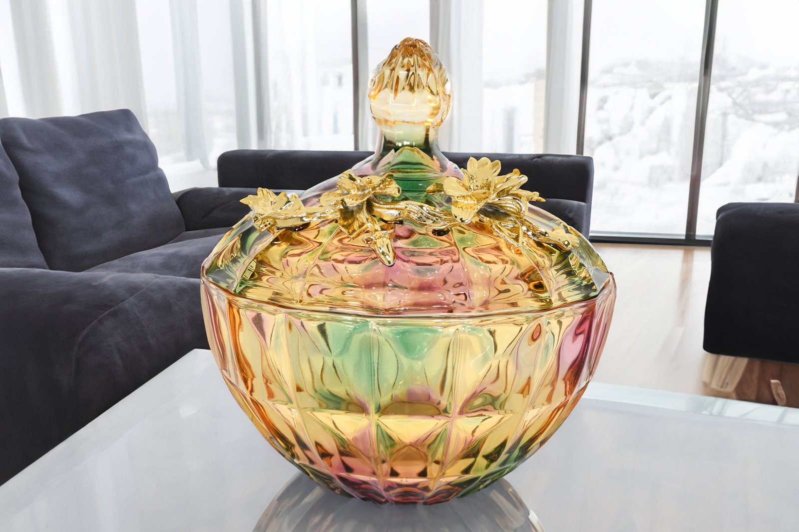 Multi Color Cut Glass Cannister With Gold Accent