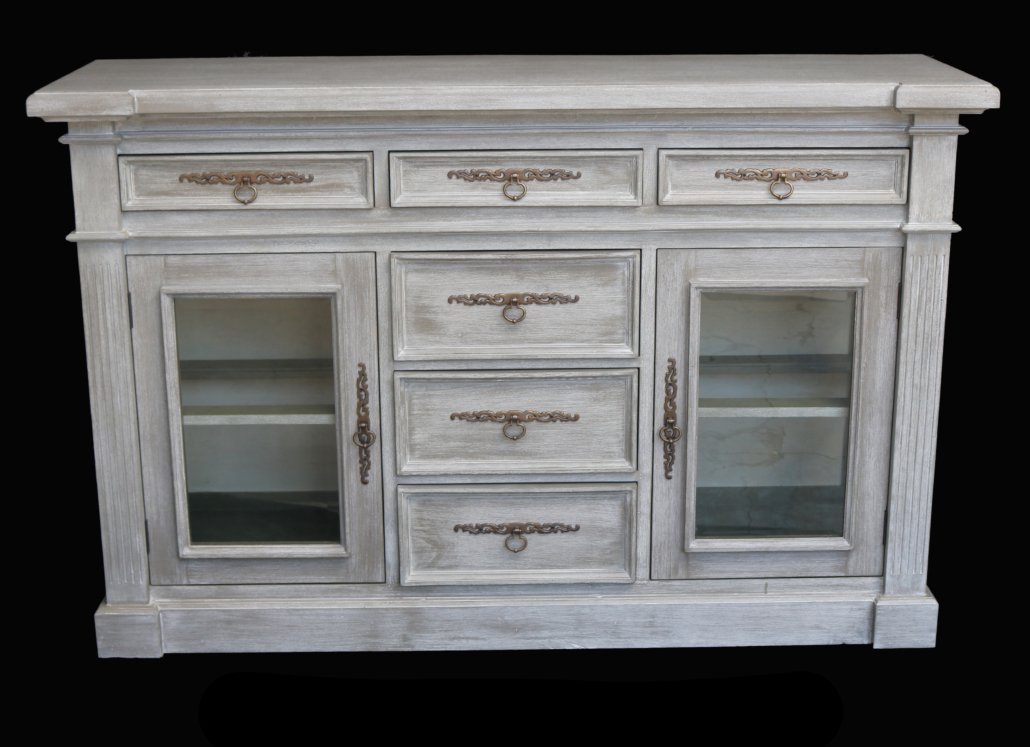 A sideboard curio which is a perfect combination of what we love of both offers glass paneled doors for displaying knickknacks and also drawers for storing the things better left hidden.
