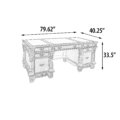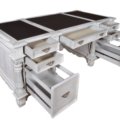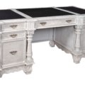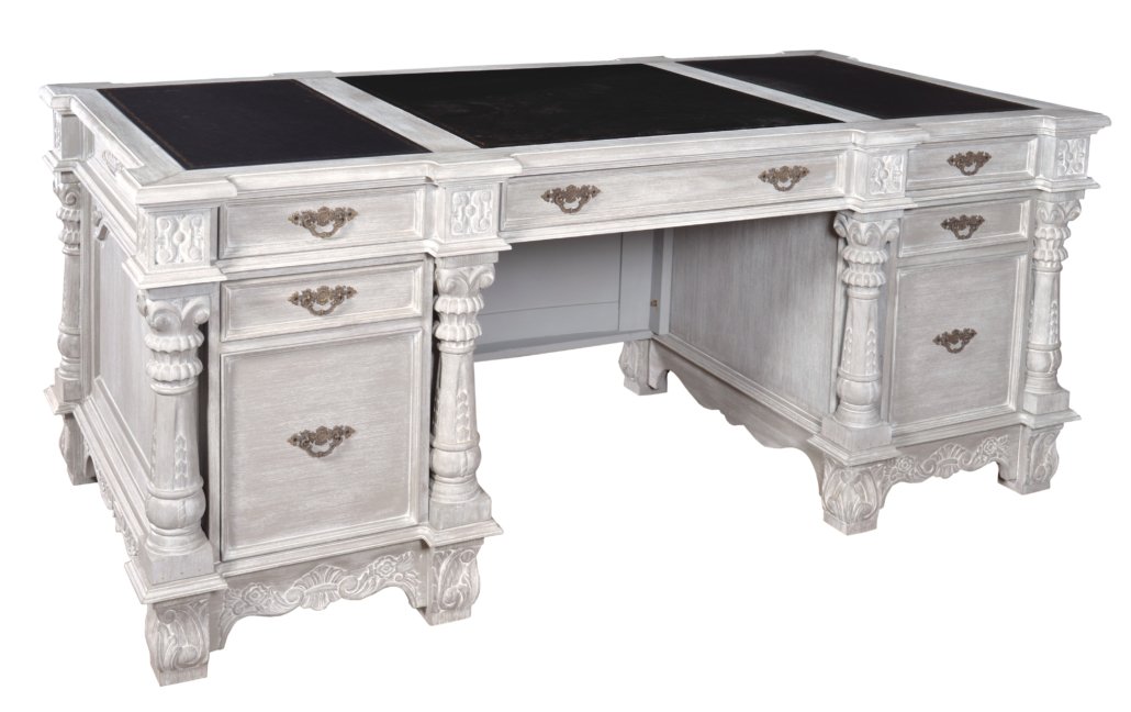 Mystique Grey Monarch Mahogany Executive Desk is a premiere Desk 80 inches wide x 40.25 inches deep x 33 inches Tall. You will be impressed by the desks features with 7 beautifully gliding drawers of which the lower 2 on either side are actually very large functional Lateral or Vertical file drawers, it features a matching tooled leather desk top, the knee hole is a spacious 29x30x26.50. This Presidential Style Desk is from our new Mystique Mahogany Collection from Heritage a division of AFD Home lends richness to a simpler luxurious lifestyle. It is truly one of the most intricate and beautiful hand-carved desks in the market, second to none and regardless of price. Our Mystique Grey Monarch Mahogany Executive Desk is made of all hand-selected solid Mahogany wood that is tastefully finished in our intermediate Mystique Beige, a neutral or achromatic color. Our finishing technique has evolved over the years and the Mystique Beige is so placeable by todays top designers because it is truly a color that is without color. A salute to a new sophisticated lifestyle it is a combination of finish and design that celebrates the beauty of the fine grain of the Mahogany wood and enhances the vestiges of this rich wood gloriously visible in a tone that will create solidity to your overall design. Minor assembly of the fully assembled top to the 2 completely assembled bases allows for easier placement through doorways and into your destined office or home.