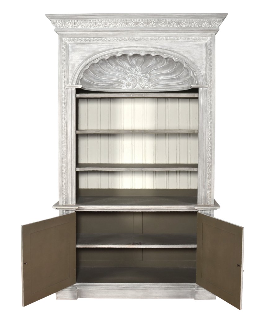 The Mystique Grey Shell Library Bookcase is a beautiful hand made bookcase with versatile shelf adjustment capabilities. The item shown is finished in our Mystique Grey finish and can be combined with many other accompanying items with this popular new finish. Heritage is a fine hand made furniture collection in the purest of standards of age old traditional crafting. Each piece is hand carved one piece at a time by some of the worlds best carvers. In addition, the item in its final form is stress and pressure tested prior to finishing to ensure long lasting stability in most all climates, a Heritage Brand standard. The final step of hand making furniture is the application of the beautiful hand applied finishes. The specialty finishes used combine hand applied layering, glazing, padding, distressing and crackling techniques and complete the beauty and value of owning timeless Heritage Furniture, a quality that will last for generations of ownership. Made by hand and imported from Indonesia