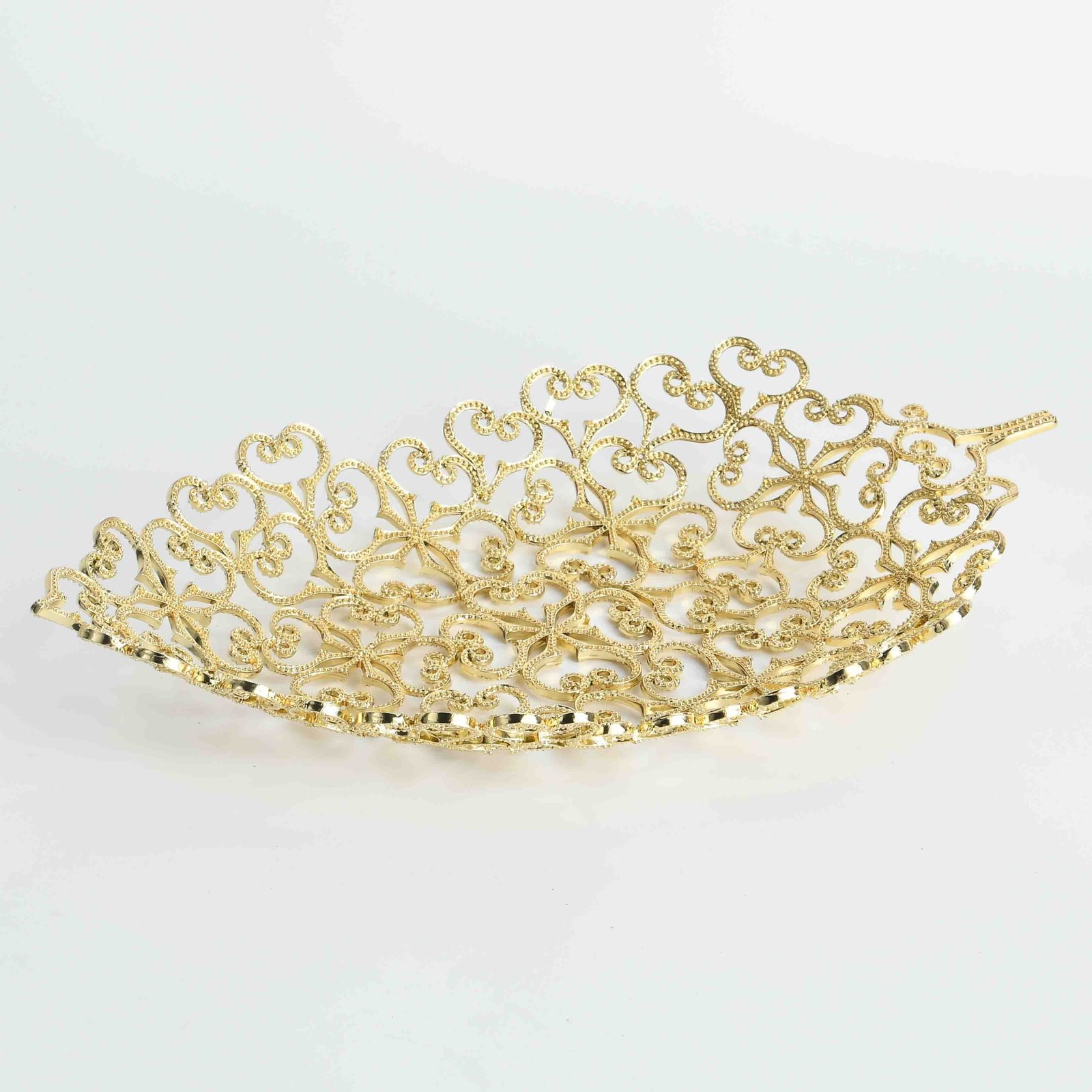 Add a touch of elegance and refinement to any space with the Ornate Gold Leaf Decorative Tray. Crafted in the graceful silhouette of a leaf and adorned with intricate openwork scroll detailing, this shimmering gold tray serves as both a functional catchall and a luxurious accent piece. Perfect for displaying jewelry, keys, or simply elevating your tabletop decor.