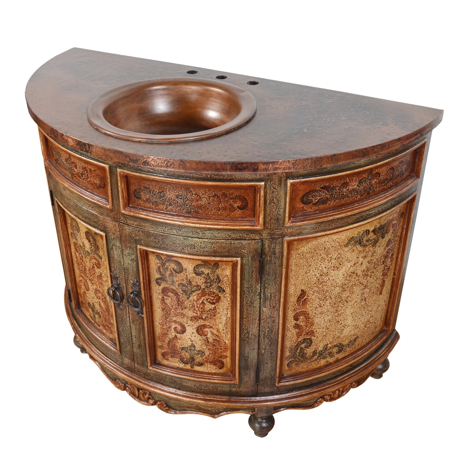 The Peruvian Copper Top Vanity is a 48″ wide single bowl vanity. The vanity is beautiful and decorative as well as designed to make installation as easy as possible. It comes with a mounted hand hammered copper top and bowl with pre-drilled holes for faucets the back was designed with an opening to allow for easy plumbing hook-ups. This collection boasts a Spanish influence with its large scaled details in a finish of varying tones of rich darker tones featuring a contrast of distressed creamy beige and delicately detailed with hand painted scrolls. Consider ordering 2 for a large master bath application or for smaller space requirements consider our equally beautiful Lima Copper Top Vanity with an efficient 25″ width. The Peruvian Copper Top Vanity is part of our Santa Lucia Collection consisting of handmade, hand painted, and distressed solid wood furniture making each piece a timeless investment. Hand crafted treasures made one piece at a time, under one roof, by our exclusive family owned manufacturer from Lima, Peru. Their master artisans are skilled in furniture making techniques influenced by the Spanish during the colonization of Peru. Many items in the diverse collection feature specialty hand painted finishes that have also been passed on and perfected from generation to generation. The family strives to be environmentally friendly by using woods re-purposed from haciendas and old colonial homes as well as wood indigenous to South American forests, primarily mahogany, cedar, moena and requiem. If you are a lover of beautiful painted furniture, find hill country rustic romantic, or find richness in Mediterranean lore Then you too may fall in furniture love with this fine collection.