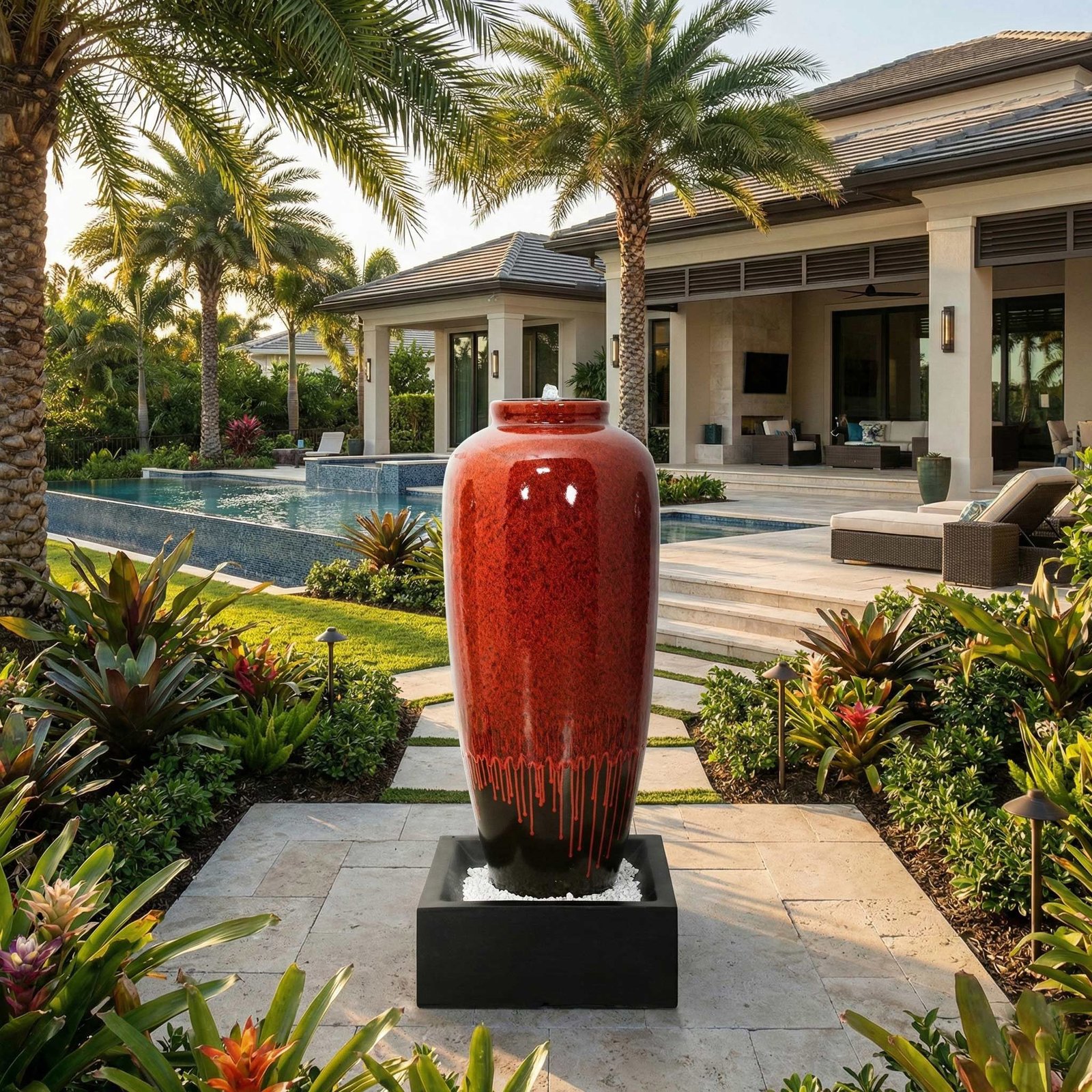 Offered is a hand cast Porcelain 45 Inch Tall, self contained bubbling fountain. Few Porcelain foundries have the large furnaces that can cast and fire such large items. The item features a rich Adobe Red fired and glazed finish. Popular for it’s ease of use, this self contained fountain comes complete with a hand cast durable all weather fiberglass basin, that will catch and recirculate the water as well as housing and hiding the included pump and tubing. Opon display, a beautiful cascading water affect using centrifugal force to cascade from top center and surround the fountain form as it propels to the recycling basin below. The craftsman have made the installation as easy as simply connecting a few hoses, filling with water and plugging it in. Pump requires standard 110 volt power. The Adobe Red Porcelain Collection is offered by AFD Home and customers can also order the Adobe Vases in up to 3 sizes 42, 31.5 and 19.5 Inches tall, for creating matching areas and bigger displays. Minor Assembly Required.
