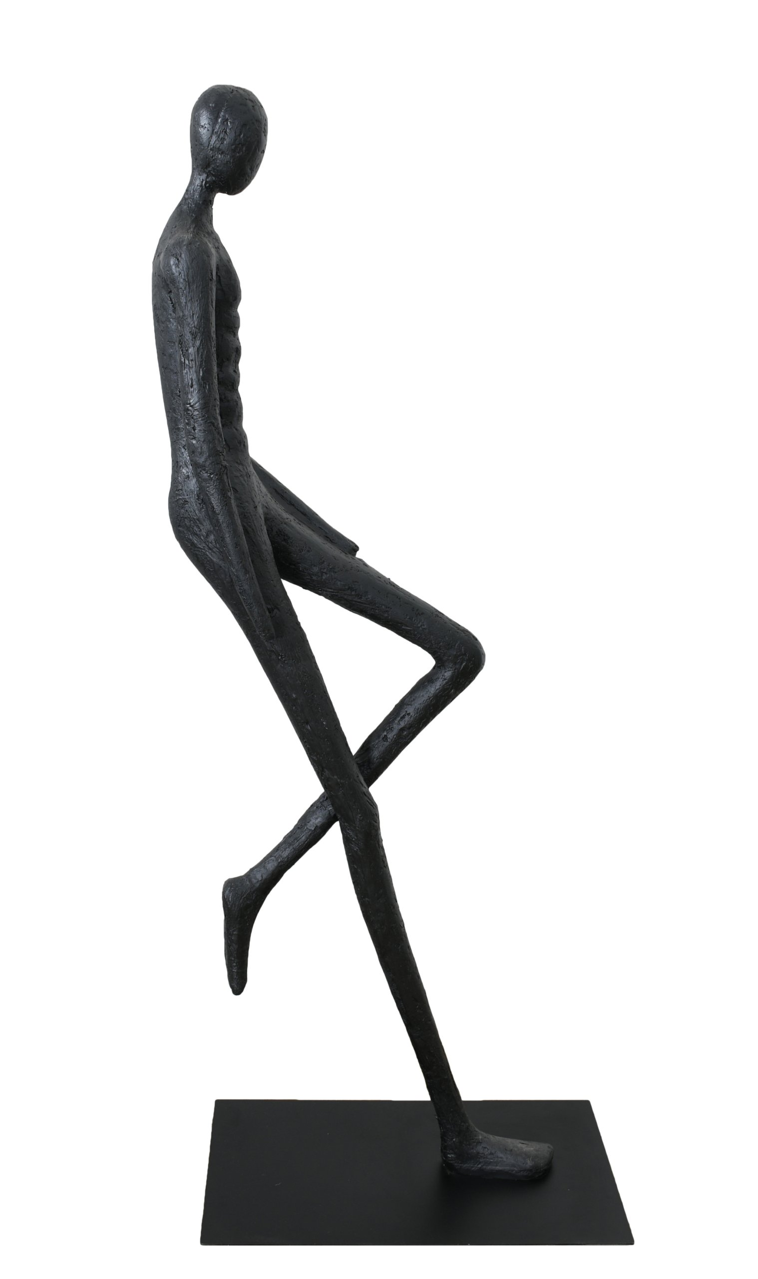 Modern abstract sculpture featuring a tall slender black figure in a relaxed pose with one leg bent and arms at the sides. Crafted with textured detailing, this contemporary art piece embodies minimalism and elegance, making it ideal for display in living rooms, offices, or galleries. The matte black finish and elongated design create a striking visual effect, perfect for modern and sophisticated interiors. A unique decorative accent that symbolizes balance, calm, and artistic expression.