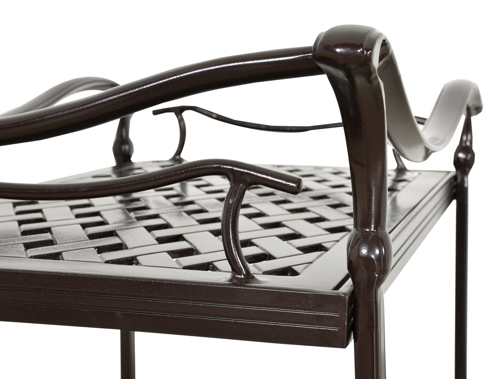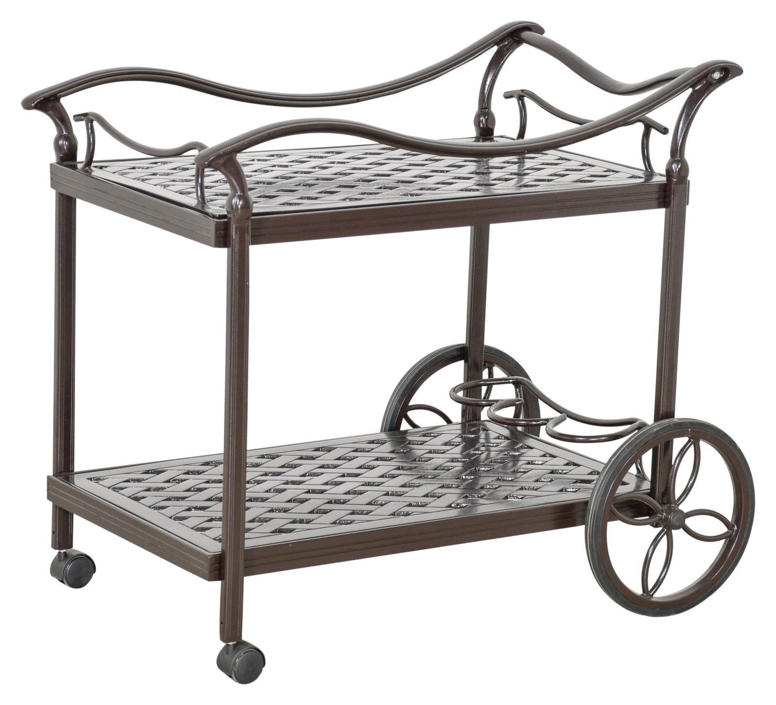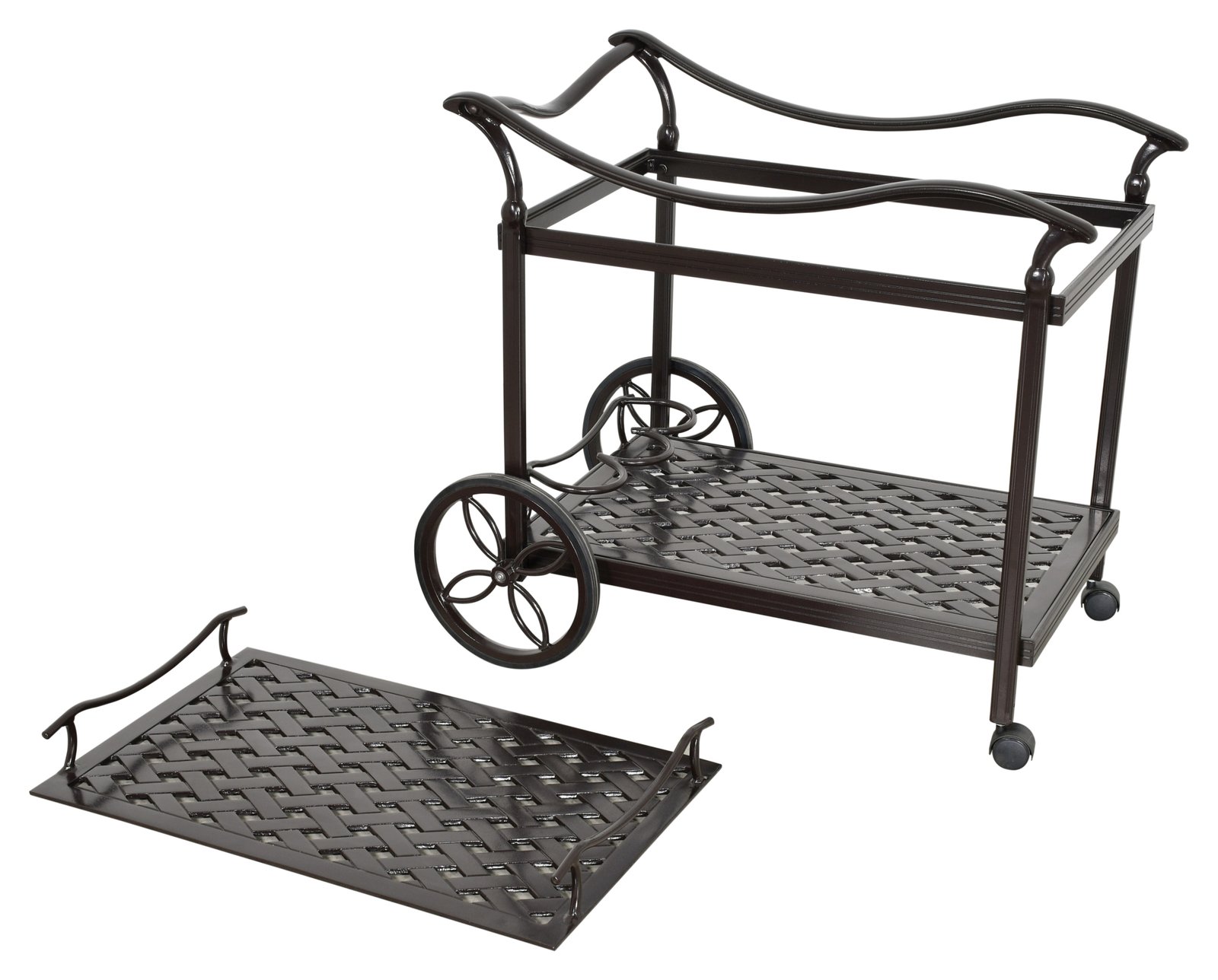 - A popular Outdoor serving Cart that would be a nice addition to anyone’s outdoor entertaining. Bridgeton Moore presents the Outdoor Aluminum Savannah Tea / Serving Cart, this mobile serving cart will make a popular addition for any backyard, the cart comes with wheels for mobility and features a large removable tray top for remote servicing of guests, the bottom tray features beverage bottle holders. Savannah is a large beautiful Collection that offers many other accompanying items, enabling you to expand and create your perfect outdoor area is this Classic Life Style Collection. The Cart is hand cast in 100% aluminum with Rubber Wheels and will never rust. Savannah is a style that is both beautiful and Timeless, a classic collection featuring a woven lattice design and a brown bronzed powder coat finish, that transcends time. Bridgeton Moore has established high quality brand standards and offers one of the best warranties in the Industry, 3 years on all frames and finish under normal conditions, fabrics are all Sumbrella grade and come with a manufacturers supplied two years against any manufacturing defects and or fading from date of purchase. Note: All products used outdoors require reasonable care and that level of care depends on varying external conditions. Covers are recommended for year round outdoor exposure and especially for all coastal applications. Extended exposure in coastal areas can cause corrosion and while this product is used in many coastal applications, they are voided from warranty. Simple hosing down or rinsing off salt exposure if any will protect and extend the beautiful finish. The fabrics can be easily cleaned in a variety of ways and Sumbrella fabrics are so colorfast they can withstand even the use of bleach. Assembly Required!