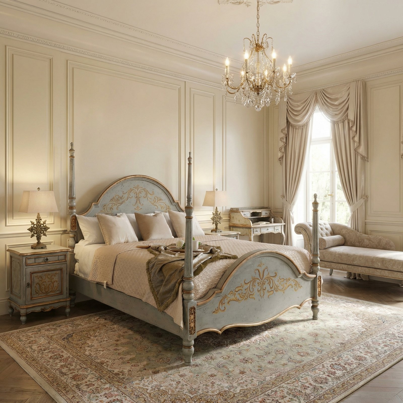 The Serena King Bed from our Serena Series is an 84″ tall standard eastern king size bed with classic posts. This collection boasts a Spanish and French influence with its large scaled details in a finish of varying tones of soft bleus and detailed with hand painted soft scrolls. Also available in queen size and Serena matching nightstands are also available in the series. The Serena series is part of our Santa Lucia Collection consisting of handmade, hand painted, and distressed solid wood furniture making each piece a timeless investment. Hand crafted treasures made one piece at a time, under one roof, by our exclusive family owned manufacturer from Lima, Peru. Their master artisans are skilled in furniture making techniques influenced by the Spanish during the colonization of Peru. Many items in the diverse collection feature specialty hand painted finishes that have also been passed on and perfected from generation to generation. The family strives to be environmentally friendly by using woods re-purposed from haciendas and old colonial homes as well as wood indigenous to South American forests, primarily mahogany, cedar, moena and requia. If you are a lover of beautiful painted furniture, find hill country rustic romantic, or find richness in Mediterranean lore Then you too may fall in furniture love with this fine collection.