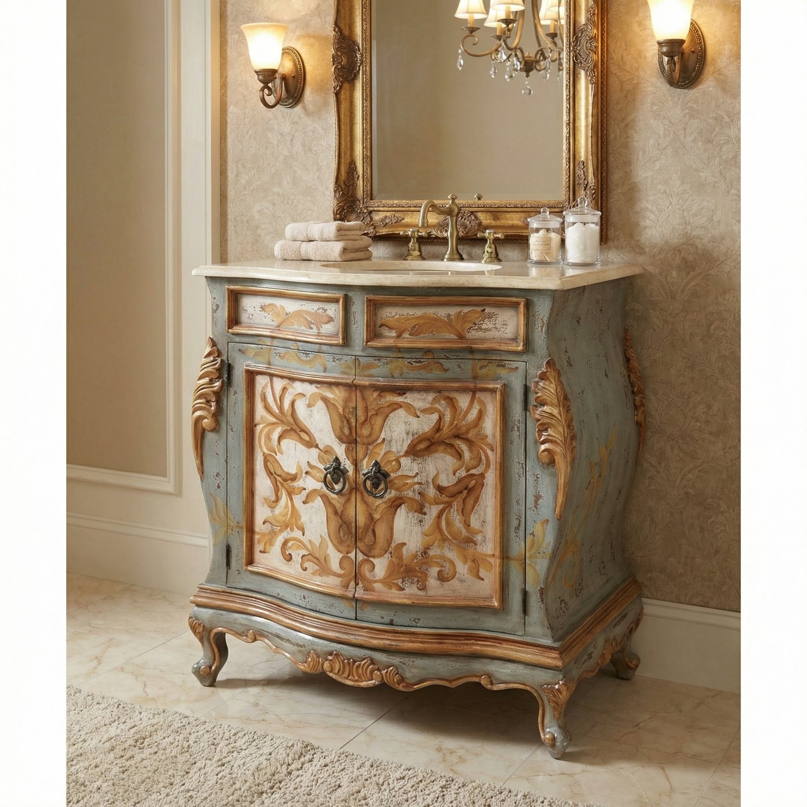The Serena Vanity from our Serena Series is a 33″ wide single bowl vanity. The vanity is beautiful and decorative as well as designed to make installation as easy as possible. It comes with a mounted beige solid marble top with pre-drilled holes for faucets, a mounted porcelain bowl and the back was designed with an opening to allow for easy plumbing hook-ups. This collection boasts a Spanish and French influence with its large scaled details in a finish of varying tones of soft bleus featuring a contrast of distressed creamy whites and delicately detailed with hand painted soft scrolls. Consider ordering 2 for a large master bath application. The Serena series is part of our Santa Lucia Collection consisting of handmade, hand painted, and distressed solid wood furniture making each piece a timeless investment. Hand crafted treasures made one piece at a time, under one roof, by our exclusive family owned manufacturer from Lima, Peru. Their master artisans are skilled in furniture making techniques influenced by the Spanish during the colonization of Peru. Many items in the diverse collection feature specialty hand painted finishes that have also been passed on and perfected from generation to generation. The family strives to be environmentally friendly by using woods re-purposed from haciendas and old colonial homes as well as wood indigenous to South American forests, primarily mahogany, cedar, moena and requiem. If you are a lover of beautiful painted furniture, find hill country rustic romantic, or find richness in Mediterranean lore Then you too may fall in furniture love with this fine collection.
