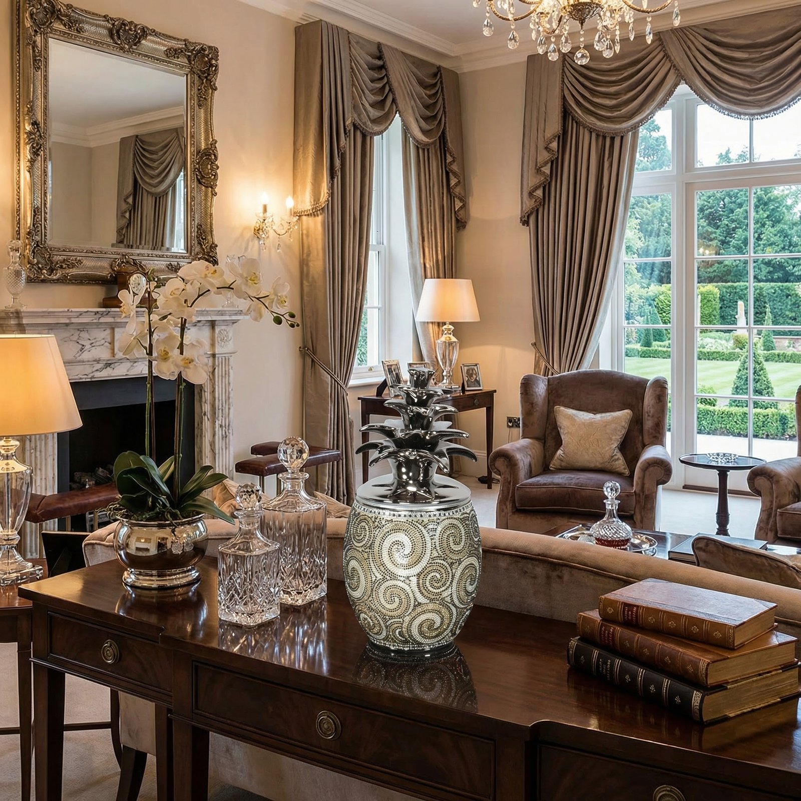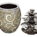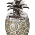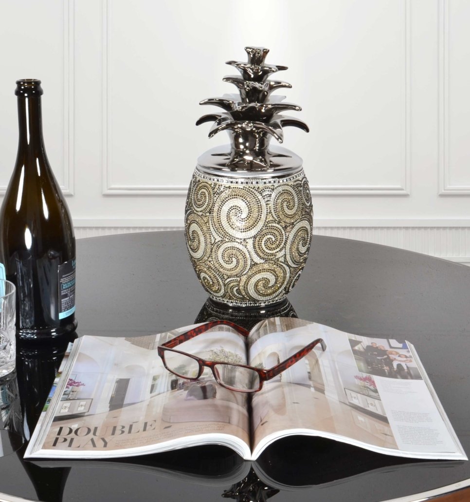 Add a designer touch to your home decor with this Silver Black Crystal Large Pineapple Canister. Hand Cast in Porcelain with Silver Plating. The vase is adorned with 100s of hand applied Rhinestone.