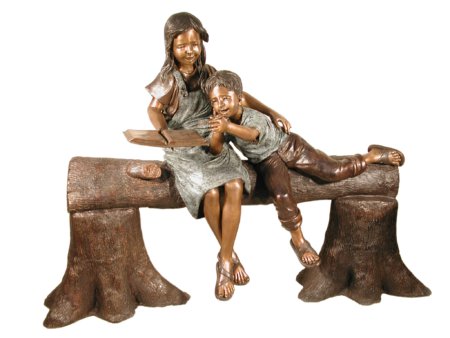 The Sister and Brother Reading on Bench 61 Inches Long is a major lifesize Garden Sculpture in Lost Wax Cast Bronze measuring 61 inches wide X 30 inches deep x 51 inches tall. One of the most popular of our garden children series an apparent big sister enjoying and reading an exciting story to her baby brother while spending time on a tree trunk bench. The Tree trunk bench design lends itself to be used in a natural setting, perhaps placed over a natural water source, stream, or brook. This Playful Garden subject is finished in a beautiful hand applied Italian Patina combination of Verde and Brown. Lost Wax Cast Bronze creations are virtually Timeless. Bronze, , as a favored metal , allows the artist to create these types of depictions in a higher level of detail as well as offering a metal that does not rust. Bronze, primarily made of Copper, actually self protects itself and creates an outer protective coating referred to as Patina. Suitable for Interior or Exterior Display. Consider collecting other Childrens Subject designs from the Childrens Collection of Timeless Creations, a division of AFD Home. Hand Cast and Finished by talented Bronze Artists in Thailand. No Assembly Required