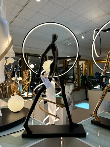 Modern abstract sculpture featuring a sleek black figure in motion framed by a circular LED light. This contemporary art piece blends minimalist design with functional lighting, making it a striking accent for living rooms, offices, or galleries. The dynamic pose and illuminated ring create a sense of movement and balance, perfect for modern and upscale interiors. Ideal as a statement décor piece, conversation starter, or artistic gift for those who appreciate unique and stylish home accents.