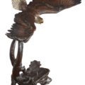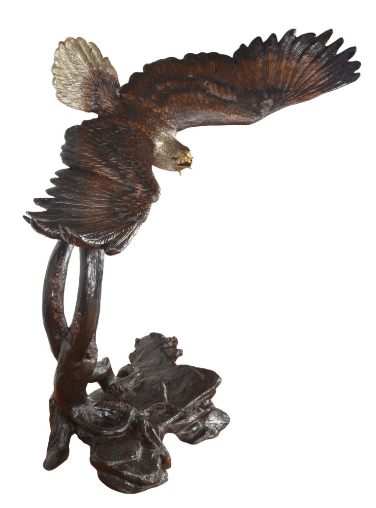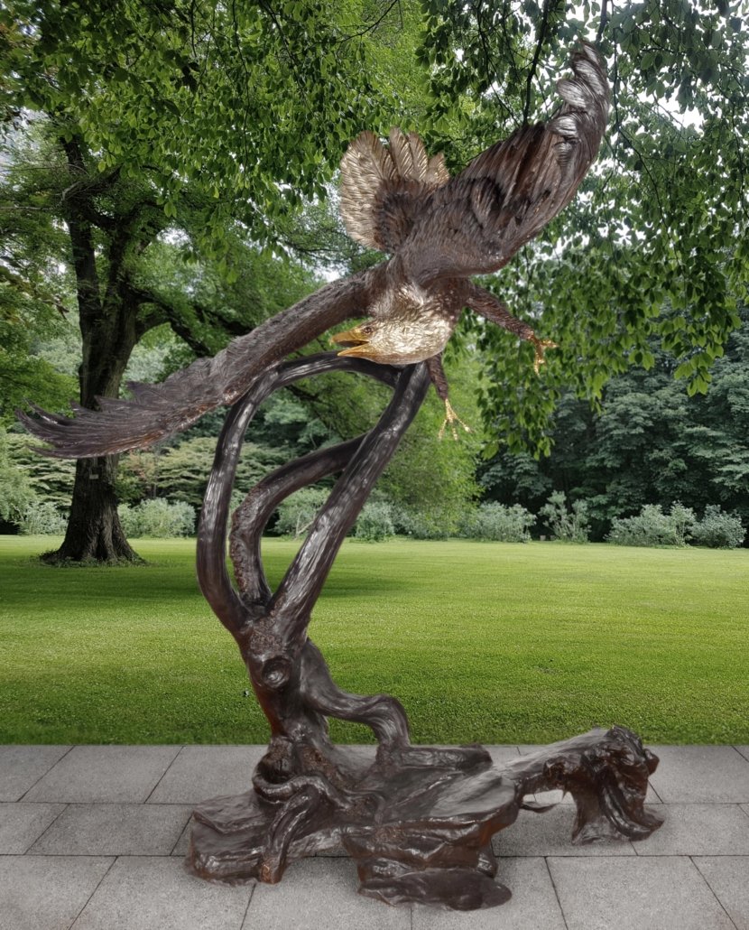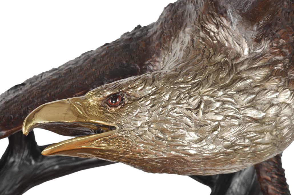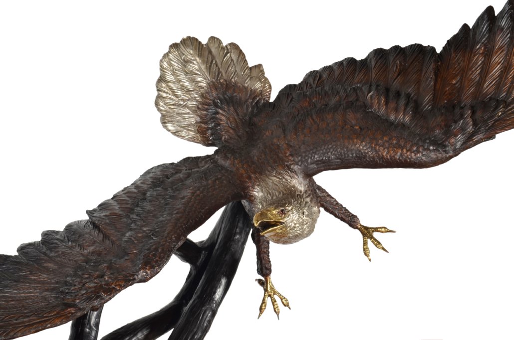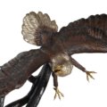 An 66 inches wide 60 inches depth and 85 inches tall major creation and a powerfull depiction of the American Eagle by the David Foundry and one of his largest works. This Foundry specializes in Audoban and especially his Eagles. Renowned for the finishing and recognized for the depiction of the action. 100 percent Cast in lost wax bronze. The finishing is a beautiful combination of multi tones of walnut patinas used to draw attention to details further work is done with silvering of the mane and tail feathers and polishing to shining detail the beaks and talons. One of his largest works and one of the best examples in the market of the Powerful American Eagle, the Eagle has been the national emblem of the United States since 1782 and a spiritual symbol for native people for far longer than that. In viewing this sculpture brings thoughts of Nature and the freedom and power it offers all species Hand made and Hand Finished, No Assembly Required.