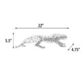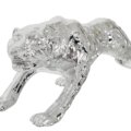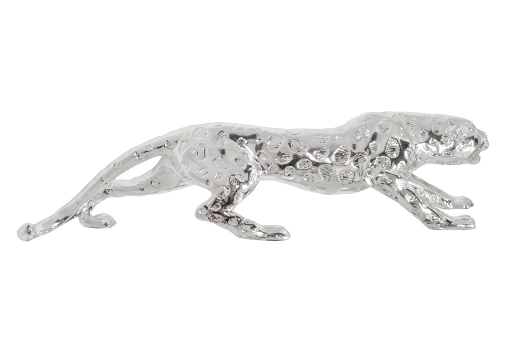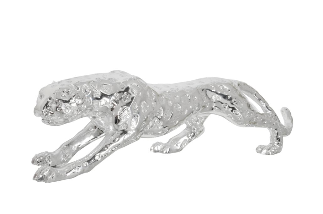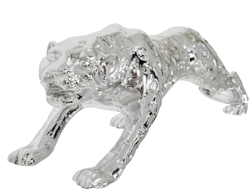 A popular decorative Standing Silver Leopard 22 Inches Long sculpture of walking Leopard, the artists depicted this animal in a prowling position showing movement. Hand cast in ceramic and resin. Features a striking Silver plated finish.