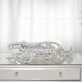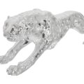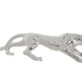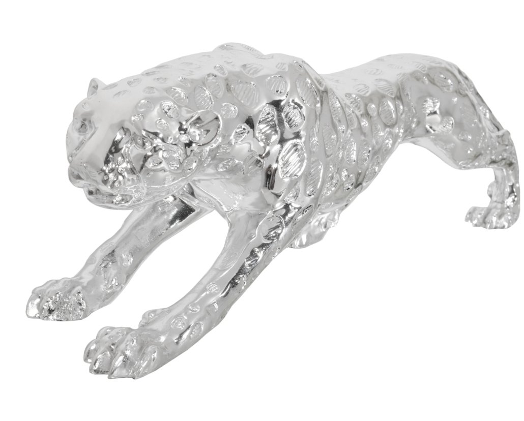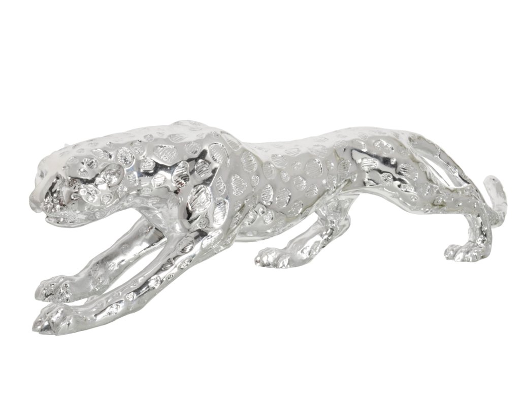 A popular decorative Standing Silver Leopard 31 Inches Long sculpture of walking Leopard depicted this animal in a prowling position showing movement. Hand cast in ceramic and resin. Features a striking Silver plated finish.