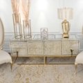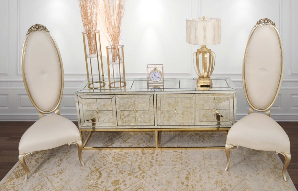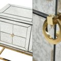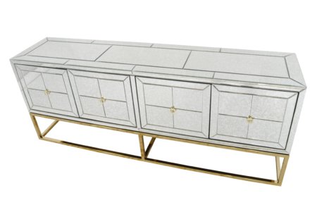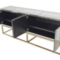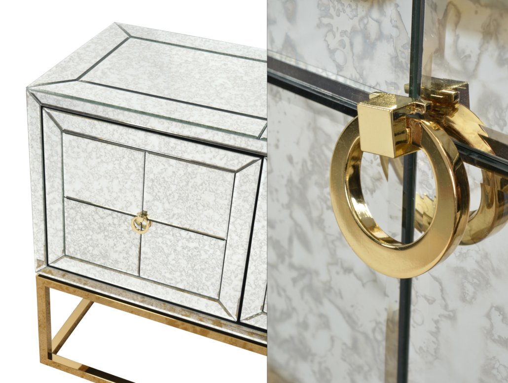 Contemporary design -Marbled mirror glass with gold highlights-Touch open Doors -one interior shelf -Great for a TV Platform