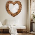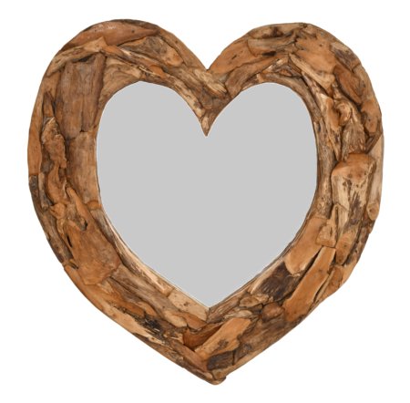The Teak Heart Wall Mirror is handmade using pieces of root wood to craft the frame. Each piece of wood is hand placed on to the solid wood backed frame creating an interesting mural design. The natural variations of the wood add to the character of each Heart Wall Mirror while making each unique in their own way.