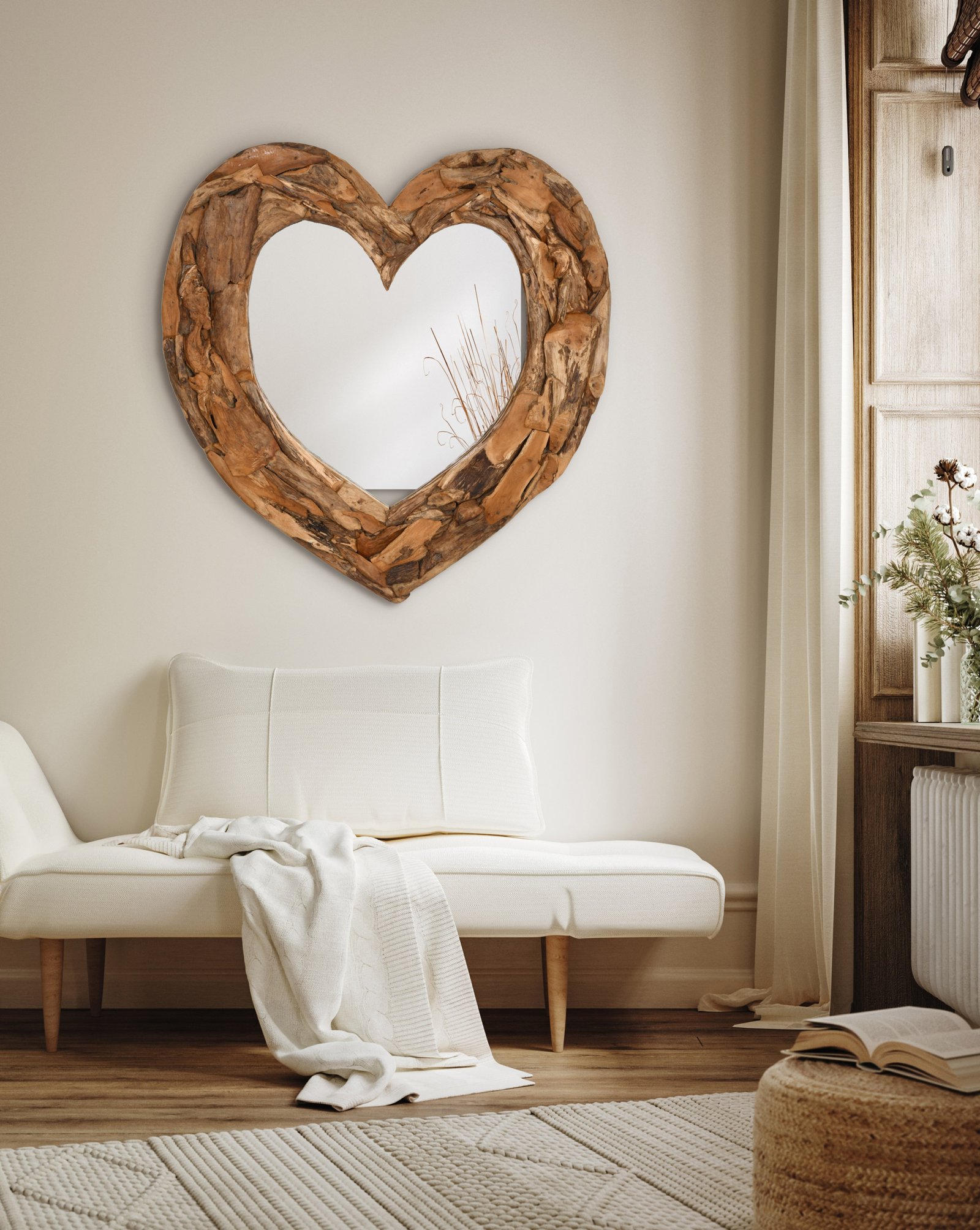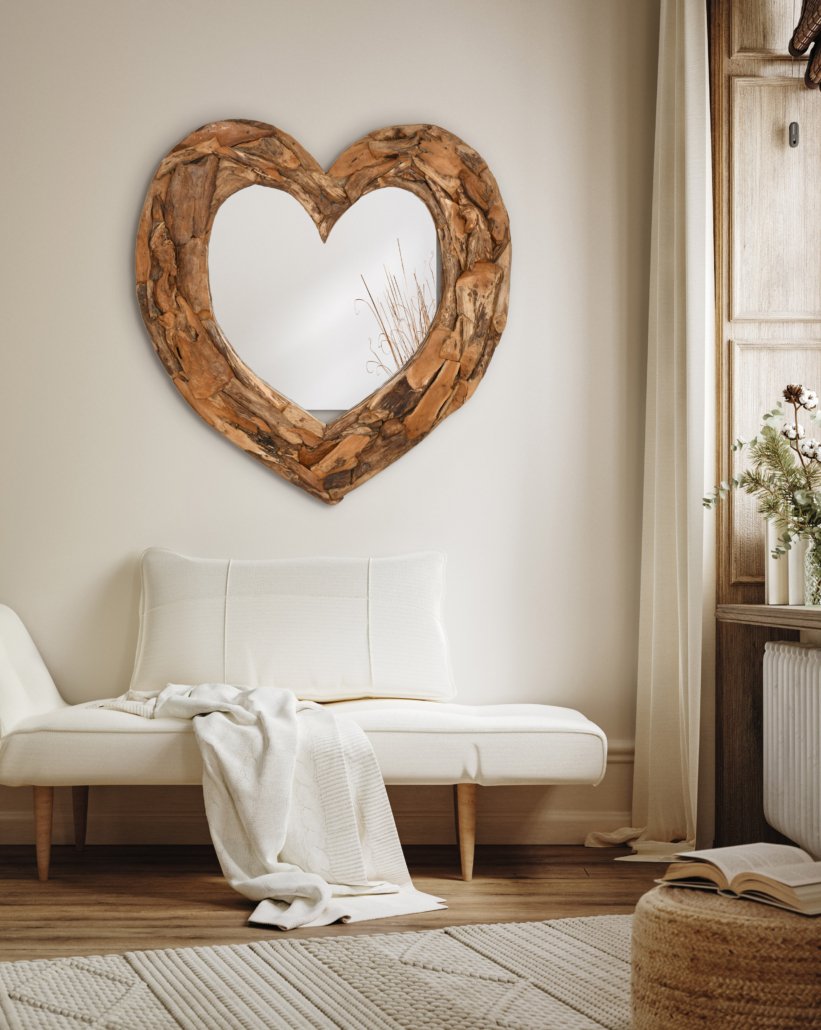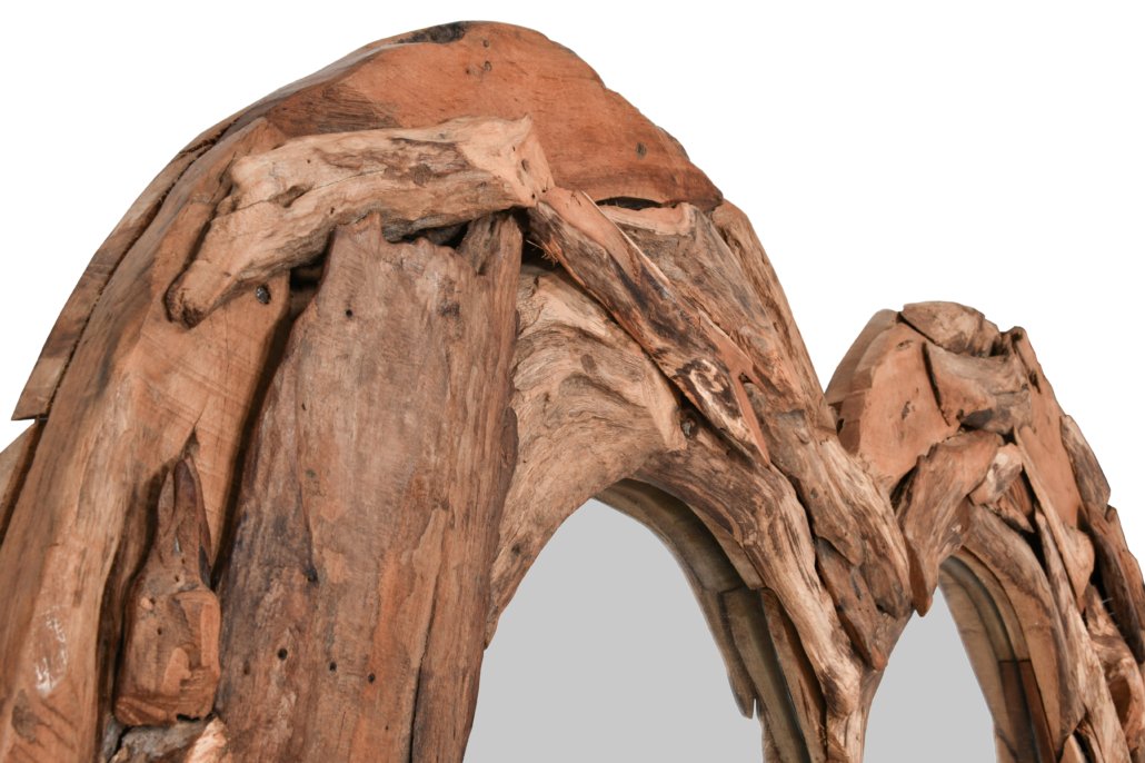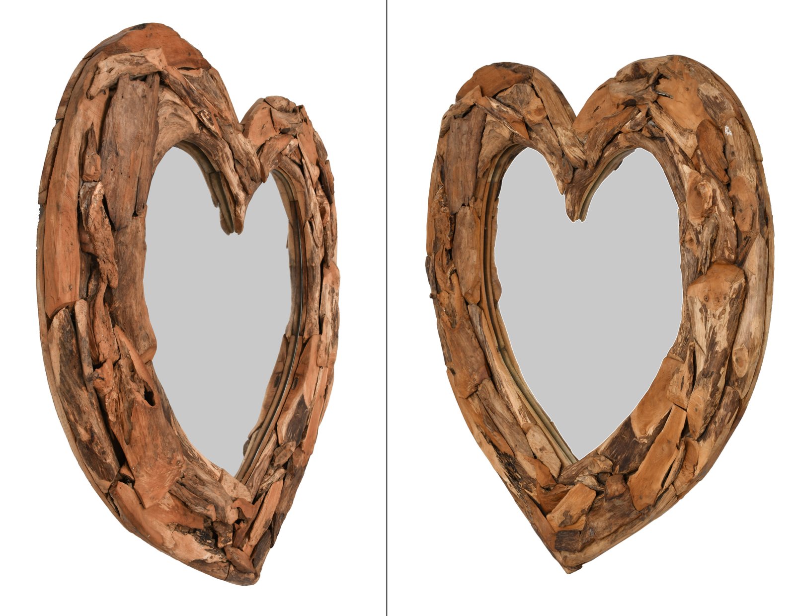 The Teak Heart Wall Mirror is handmade using pieces of root wood to craft the frame. Each piece of wood is hand placed on to the solid wood backed frame creating an interesting mural design. The natural variations of the wood add to the character of each Heart Wall Mirror while making each unique in their own way.
