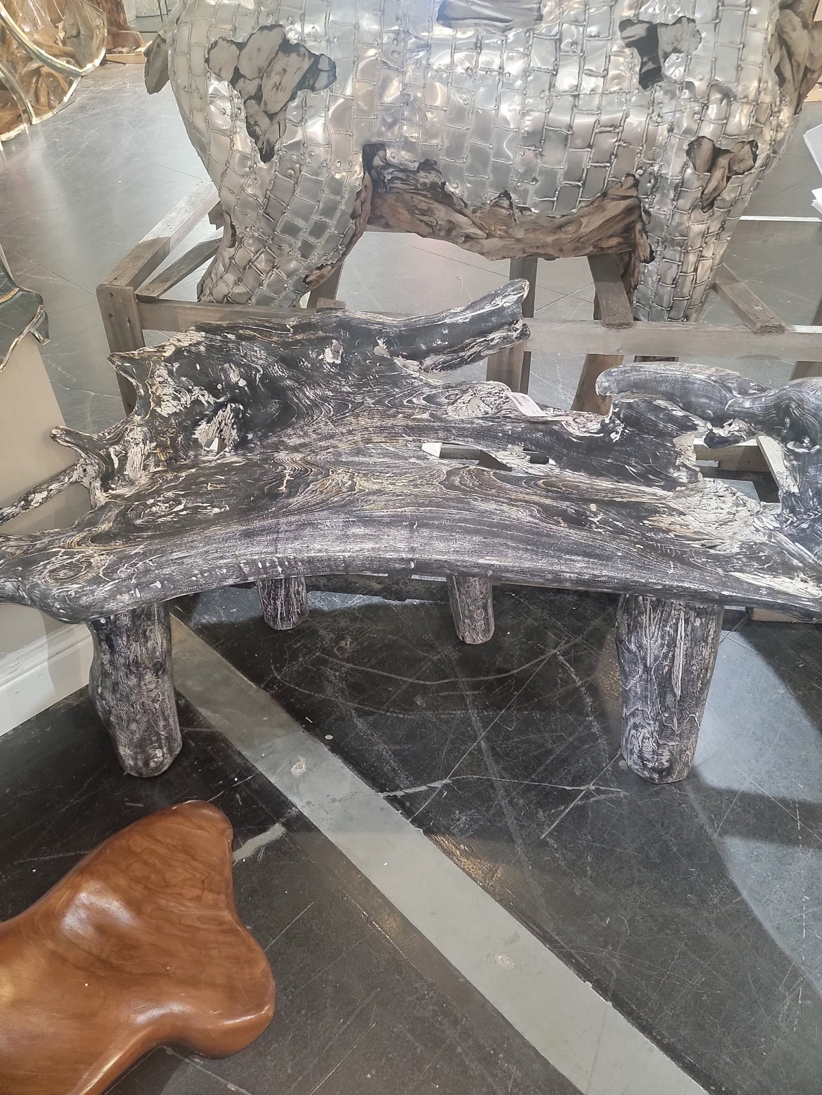All natural, no two benches are ever alike. The artisians seek out interesting pieces of wood to build the item. Afterwards a hand applied finish of black wash is applied to the bench