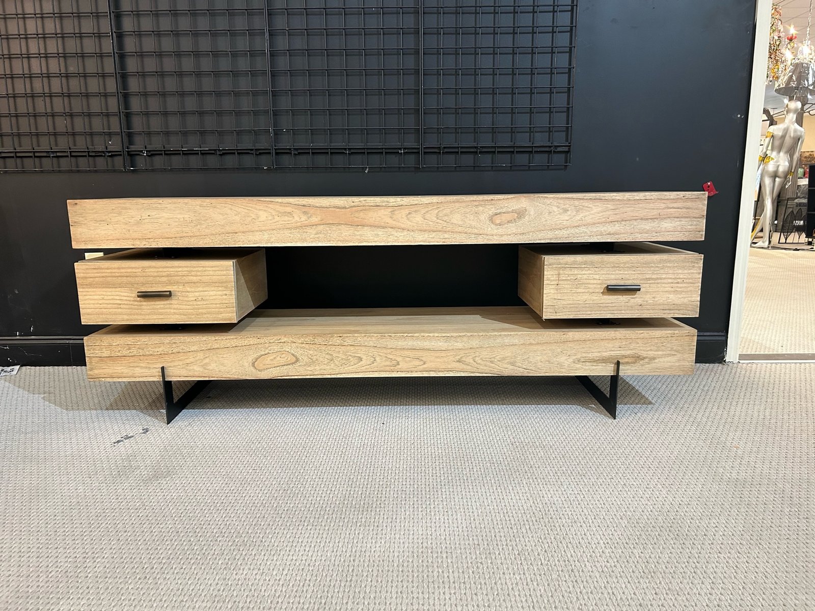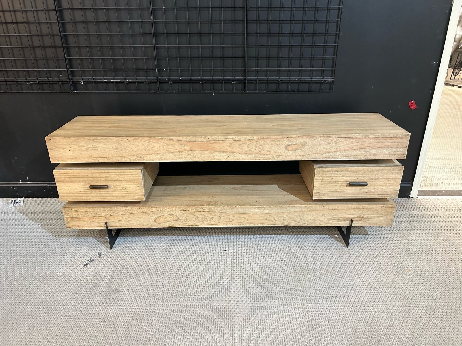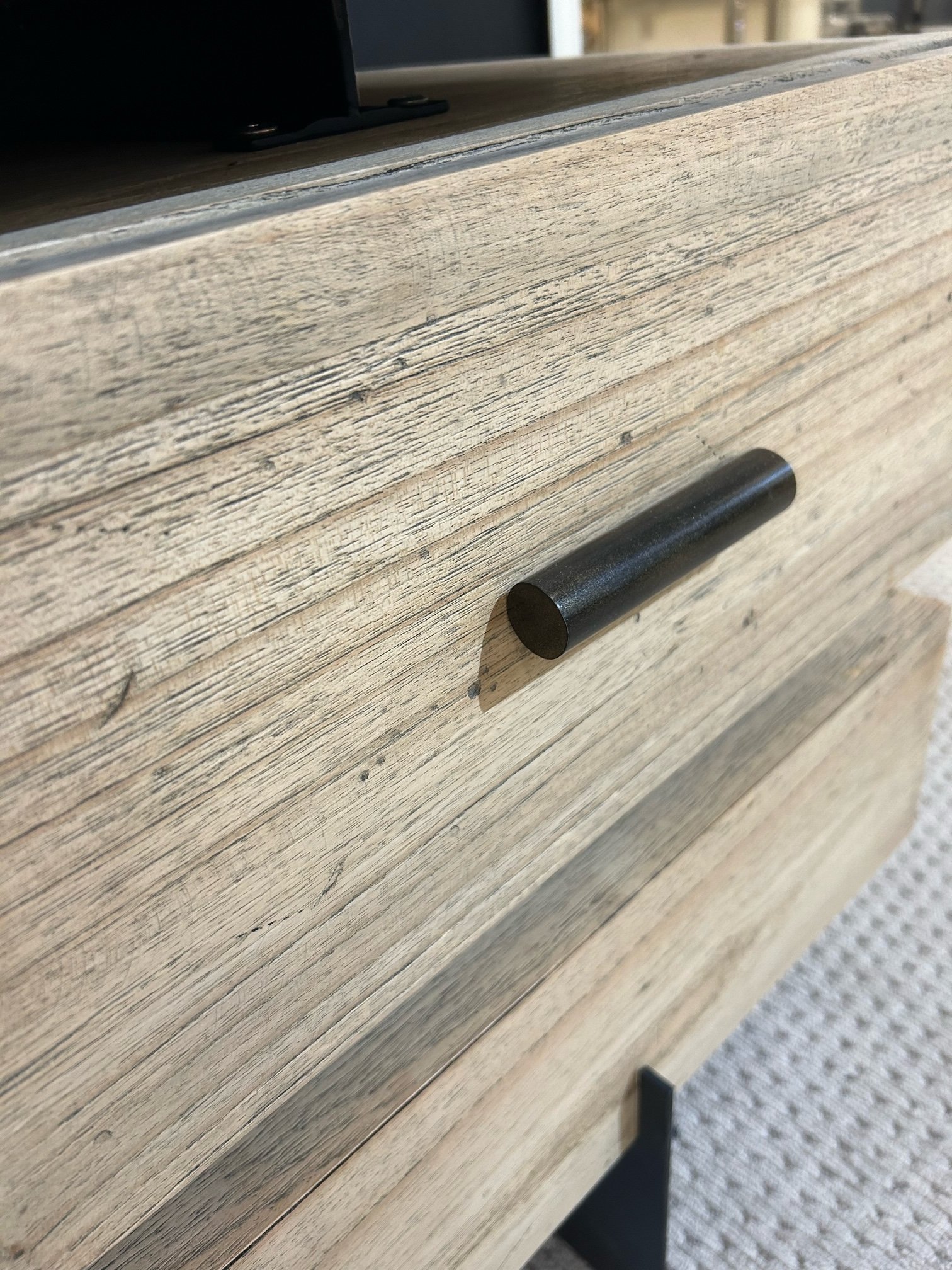 Clean modern lines accent this solid wood TV stand. The wood has been bleached and seasoned ensuring the natural wood variation is a part of the style of the piece. Functional for TV’s up to 70 inches