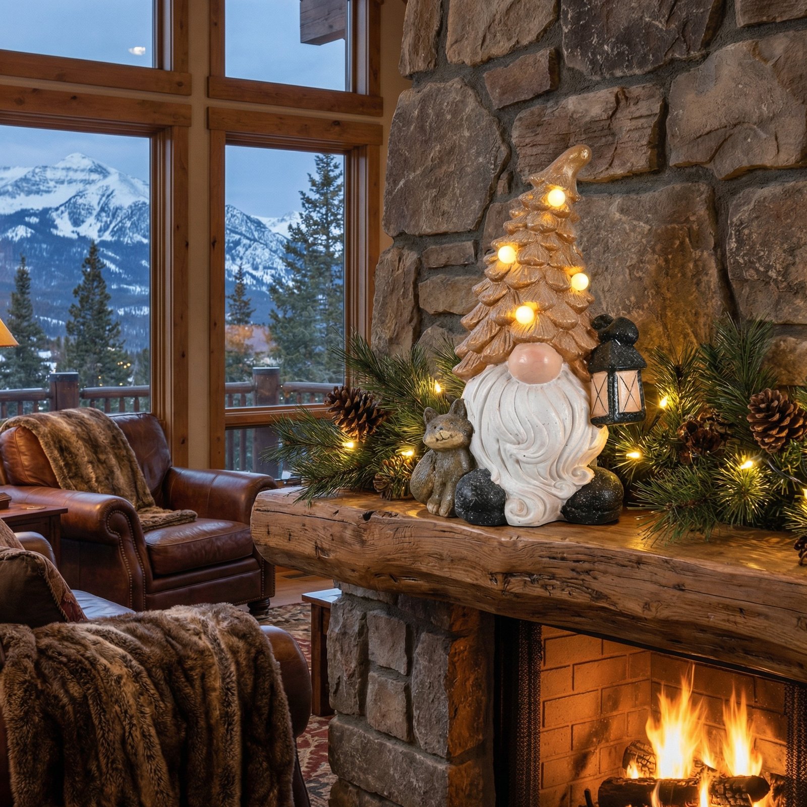 - Brighten your festive decor with our enchanting Twilight Gnome with Fox and Lantern! This adorable gnome features a shimmering pine cone hat adorned with warm LED lights, creating a magical ambiance perfect for the holiday season. Beside him sits a playful fox, adding an extra touch of charm to this delightful piece. The lantern held by the gnome adds a rustic touch, further enhancing the whimsical appeal of this festive character.Whether you place it on a mantel or table top this Twilight Gnome with Fox and Lantern is sure to bring joy and cheer to all who see it. Celebrate the magic of the season and make this charming gnome a cherished part of your holiday decor collection!