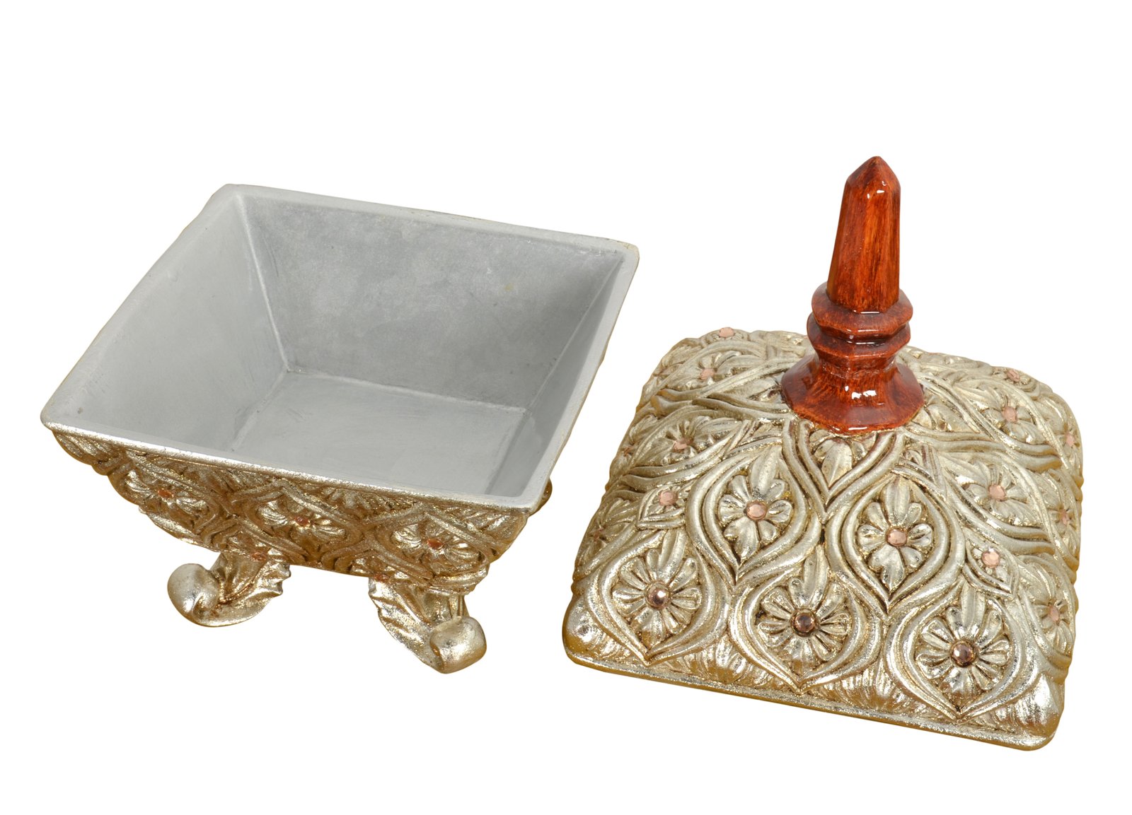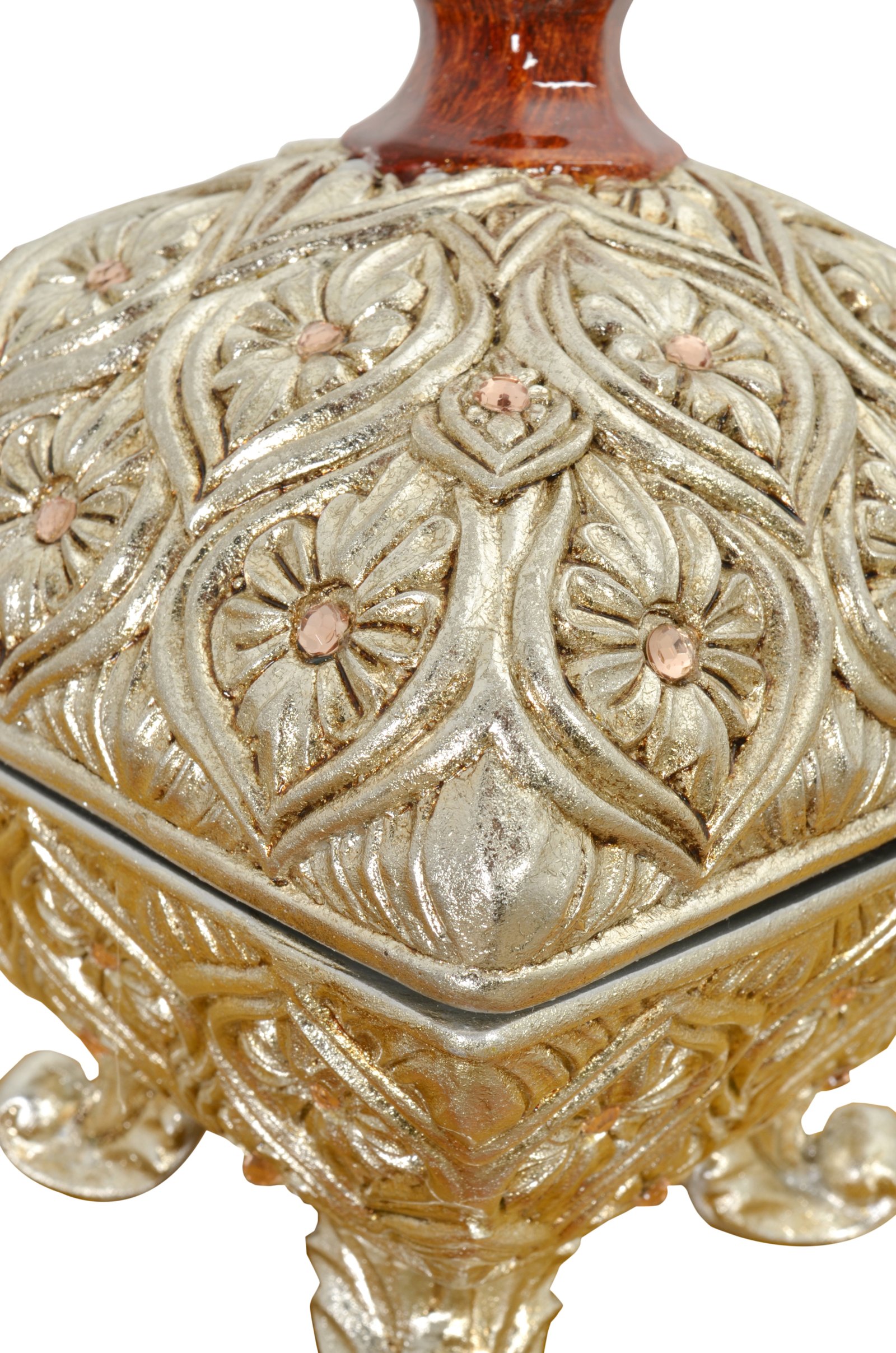 The Valencia Decorative Box with Lid is from the stunning Valencia Collection. The presence of this collection will become a point of beauty and a noticeable enhancement of any interior setting. This item is a good choice for a desk, console, vanity, or dresser for display and stylishly storing jewelry or keepsakes. The item is hand cast in durable polyresin. Hand finished in a lustrous wood tone with a dramatic contrast of antiqued silver leafing. Consider flanking it with a pair of matching Valencia Urns for a larger tabletop display. No Assembly Required