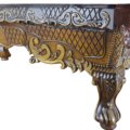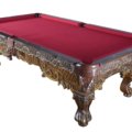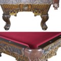 Introducing our Victorian Carved Pool Table Professional Size, hand carved and hand finished recreations of elegant Pool Tables. The Victorian design offers a large scale and is carved in 100 % solid wood. 100% Hardwood Construction with classic Victorian era carvings and hand-finished in multi-step antiqued wood finishing Hand Tooled Cordovan Genuine Leather Pockets Genuine Slate 1″ Thick, Framed Back, 3-Pieces 1″ slate arrives cut to precision fit with a solid wood slate support frame and bonded to the underside of each slate piece for ease of handling and installation. Double crossbeam construction offers proper weight-bearing capabilities Features Mother of Pearl inlaid diamond sights on rails. INSTALLATION The base of table comes completely assembled for strength, The legs require mounting to the base, The Slate will sit and mount easily on top of the base, You will appreciate that the slate is sent in 3 pieces for ease of lifting, handling and to reduce risk of breakage. The felt then layers over the slate stretched and stapled to the slate wood framing below shim, putty screws, and level where necessary and your almost Don. The final steps are the installation of the rails and pocket assembly. The rails are secured with 3 bolts and come refitted with felt. Level as you would like any table and you too can play on a table that even the pro’s would envy and your friends will ooh and ahh over. 8′ Pool Table Dimensions: Playfield -44″ x 88″; Outside -Approx. 56″ x 100″; Weight: 750 lbs.