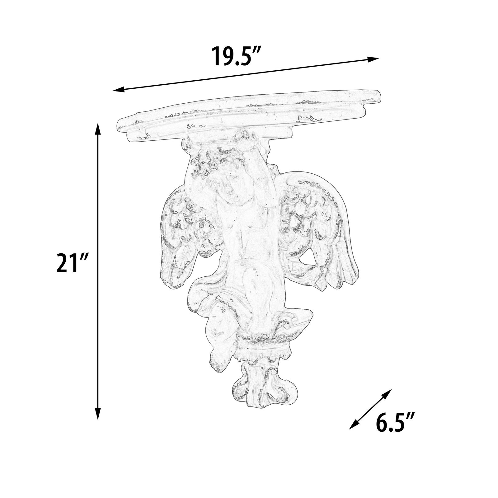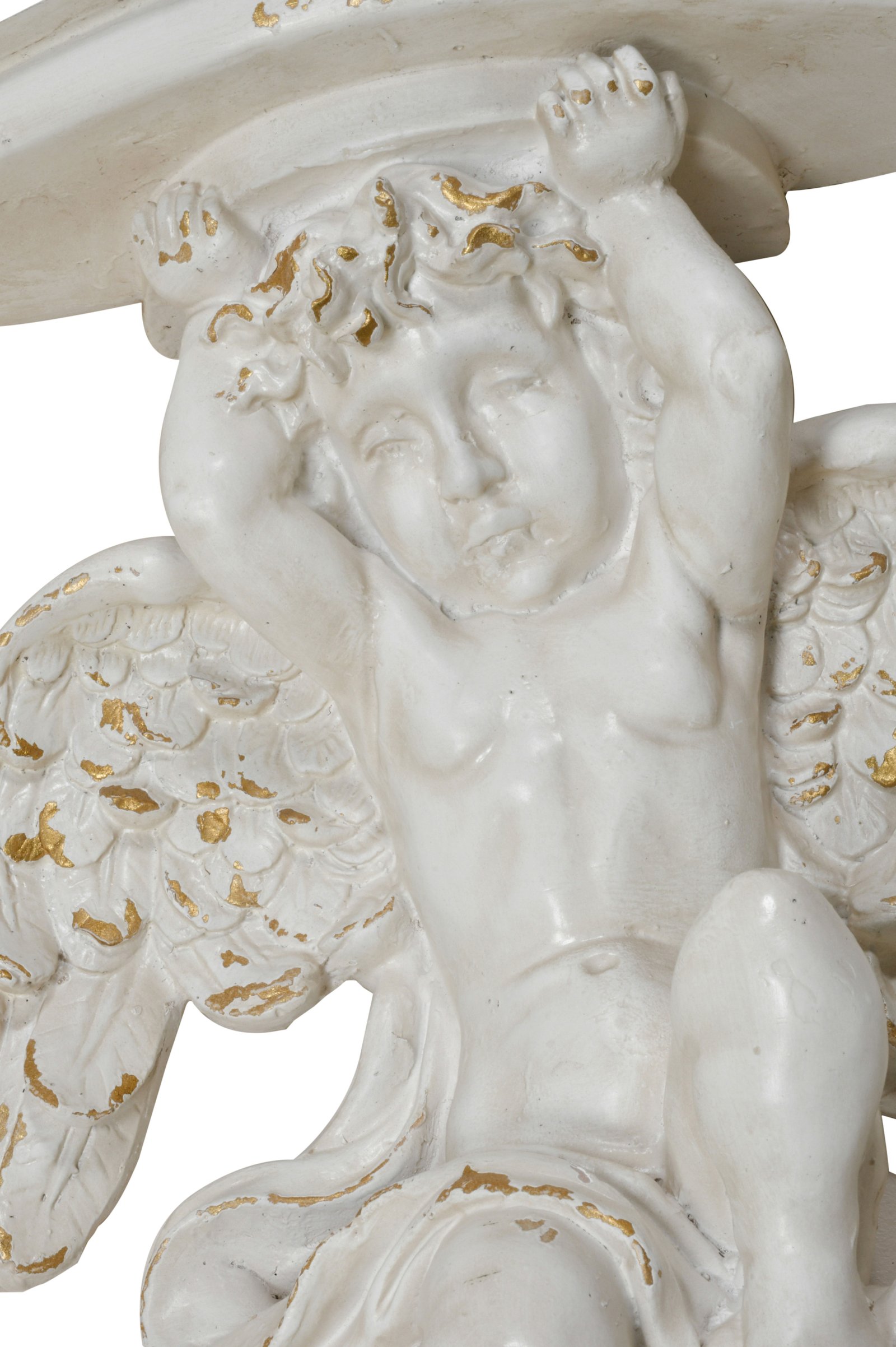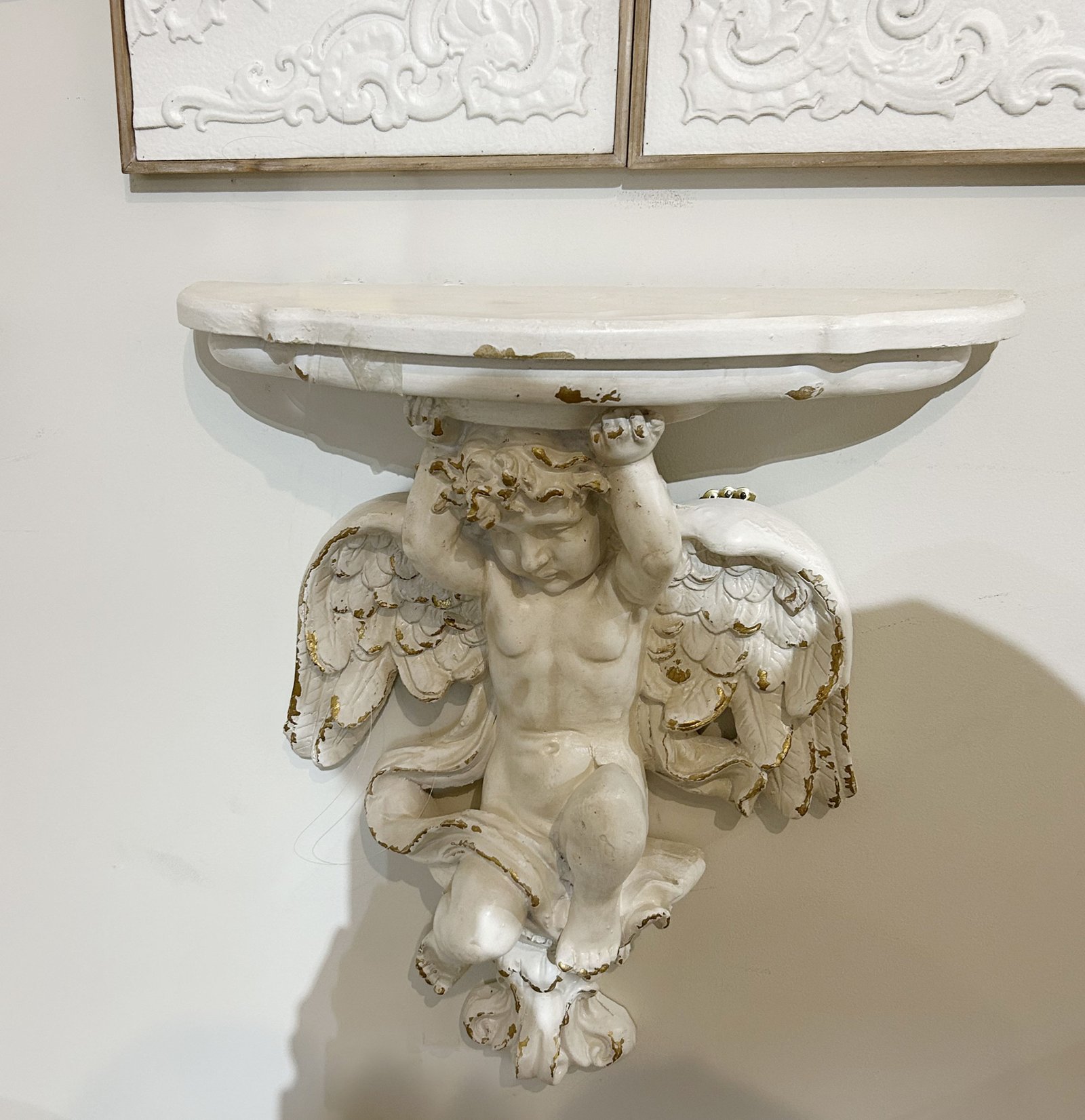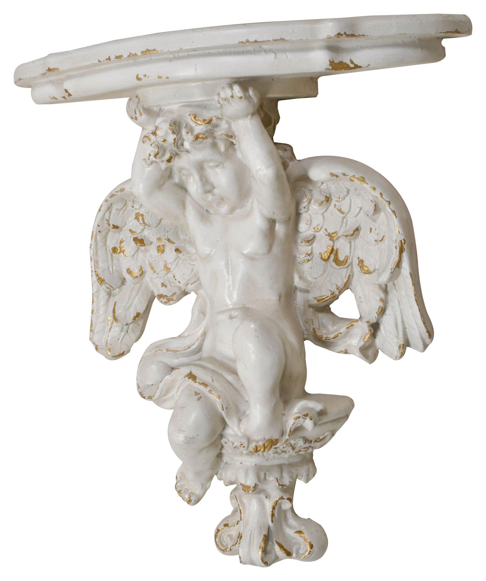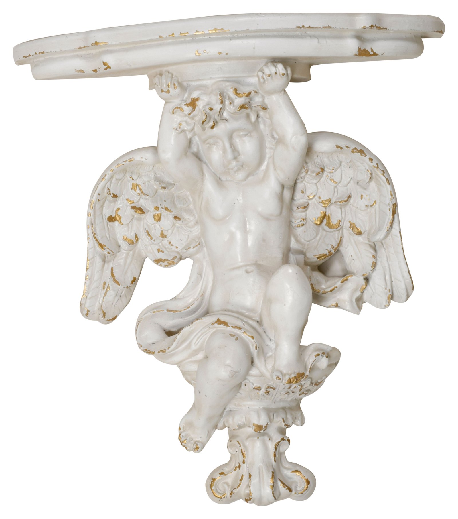An enchanting fusion of ethereal charm and practical elegance. Crafted from resin, this wall bracket features a cherubic figure with outstretched wings, finished in a distressed white with subtle gold accents to enhance its antique appearance. The bracket’s surface is ideal for displaying your favorite items, from heirloom vases to framed pictures. This piece brings a touch of heavenly grace to any setting, providing a beautiful and functional element to walls in need of a classic yet whimsical accent.