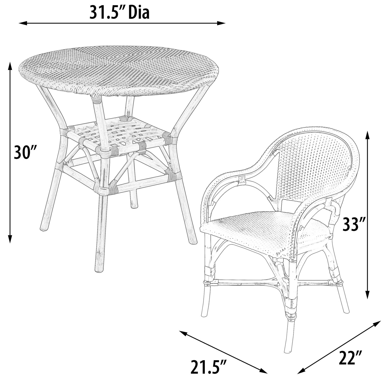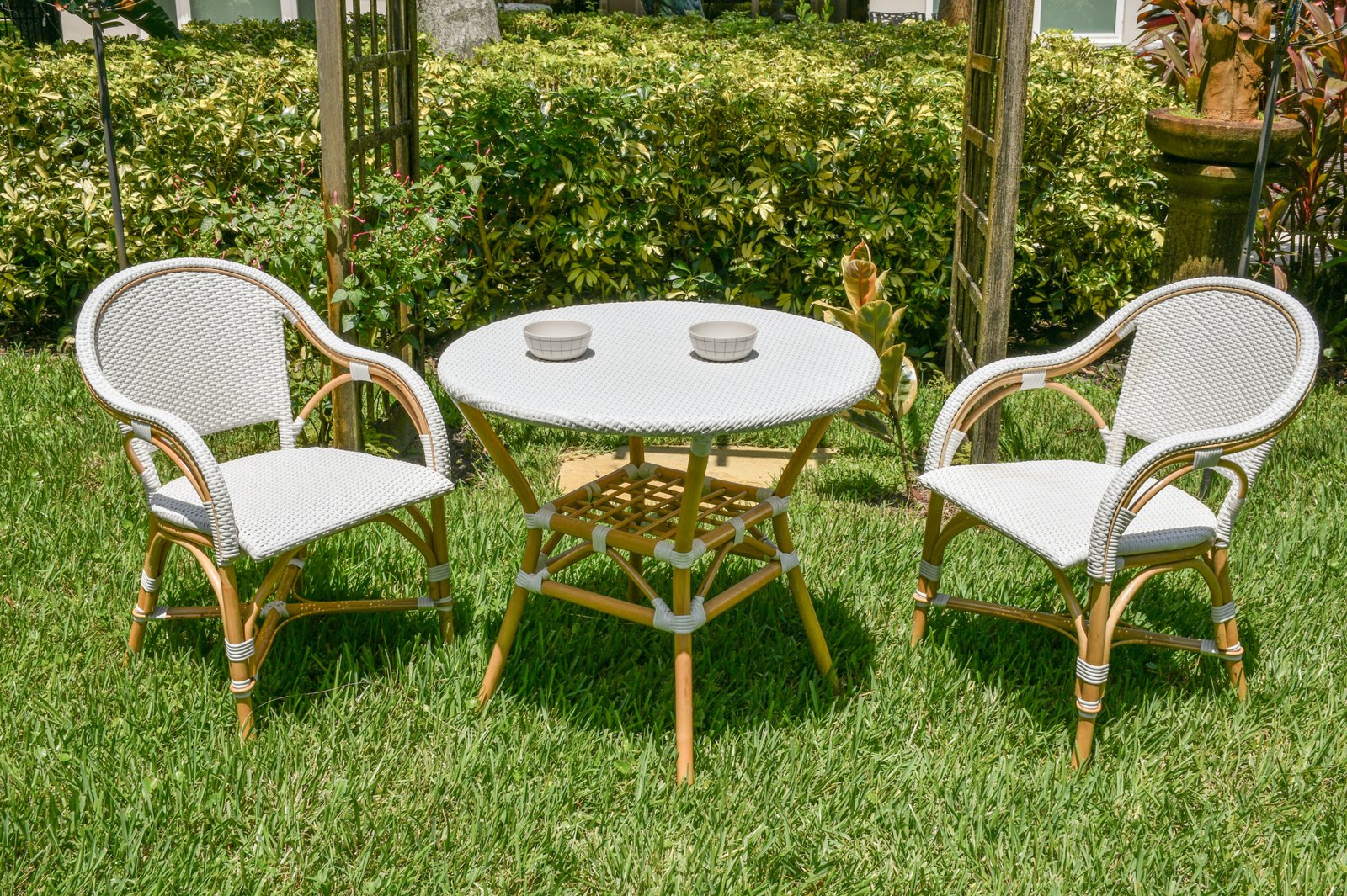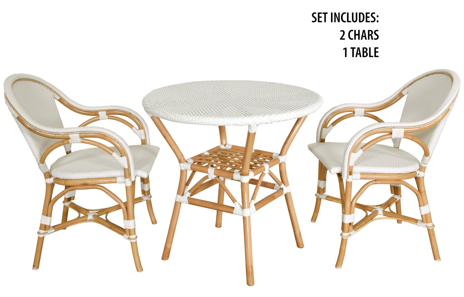 Hand crafted one piece at a time the Sierra Bistro Collection is perfect for the breakfast nook or patio. Bamboo constructed framing is wrapped in all weather wicker. Wonderful 3 piece set