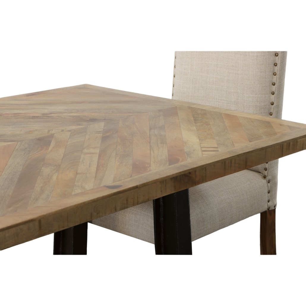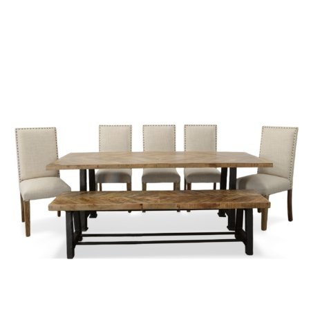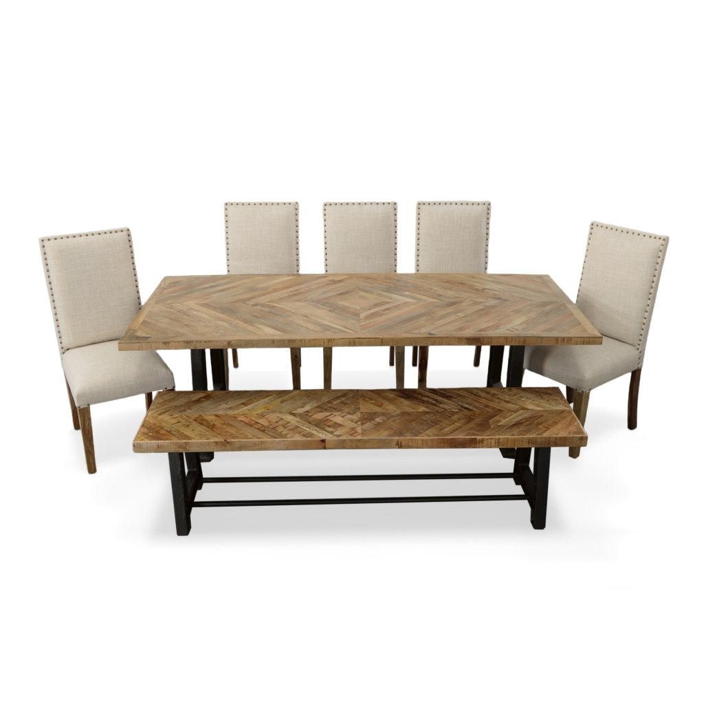 - Set Includes 1 Wood and Industrial Iron Mango Parquet Dining Table 84 Inch. 1 Wood and Industrial Iron Mango Parquet Bench 72 Inch 4 Chair Upholstered Dining Solid Wood Neutral Linen w Knailheads