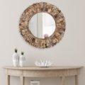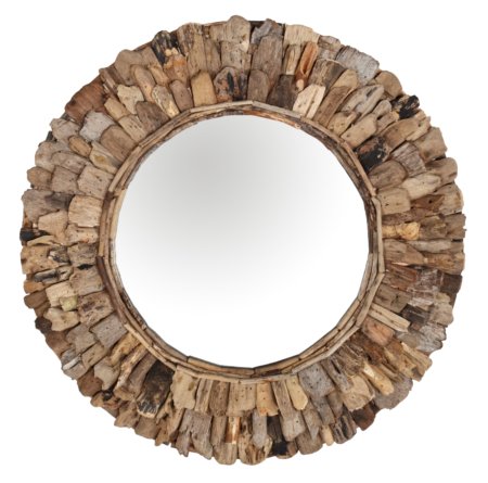A hand made 24″ Large Diameter Wood Chuck Mirror. This natural wood mirror is created by hand by the local villagers from Indonesia exclusively for AFD Home Collection. One of the beautiful characteristics of the finished creation is the way the local artisans hand select and layer the uniquely shaped wood chucks creating the outer frame. If you are looking for Functional wall d?cor with rustic and even a primitive style to either accent or add contrast to your interior design, This small Wood Chuck Round Accent mirror may be the perfect size but for customers desiring a bigger mirror consider the Large Round Wood Chuck Mirror 120 Cm ( 48″ dia. ). No Assembly Required!