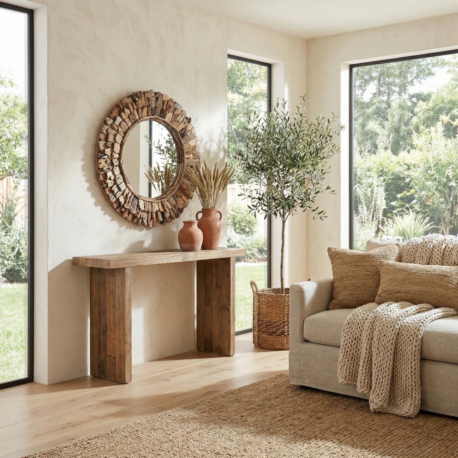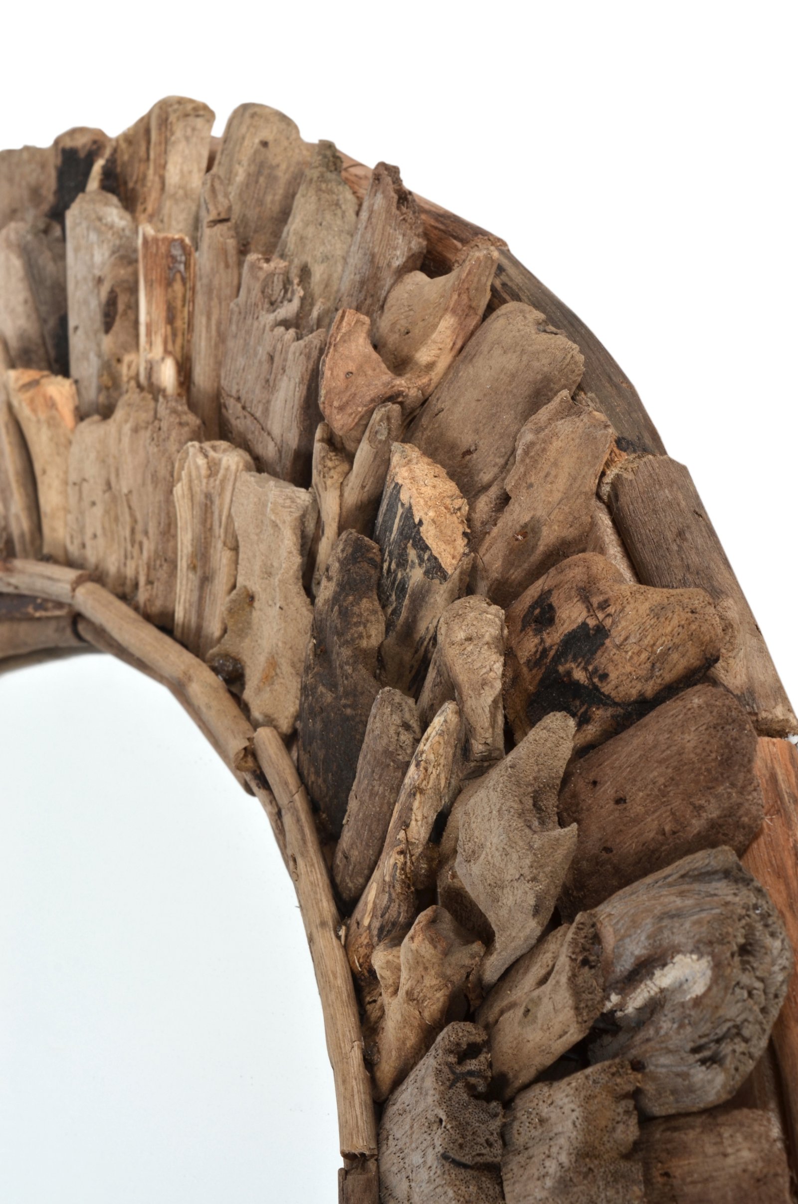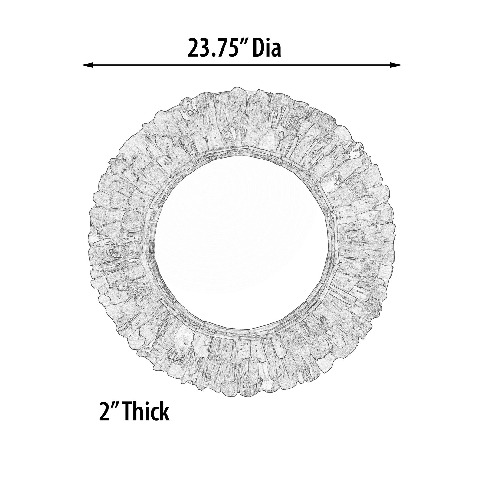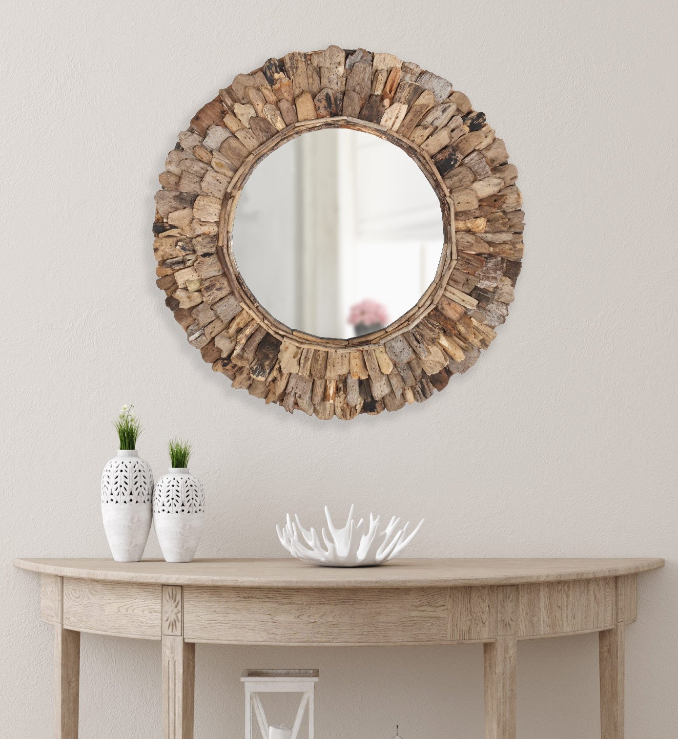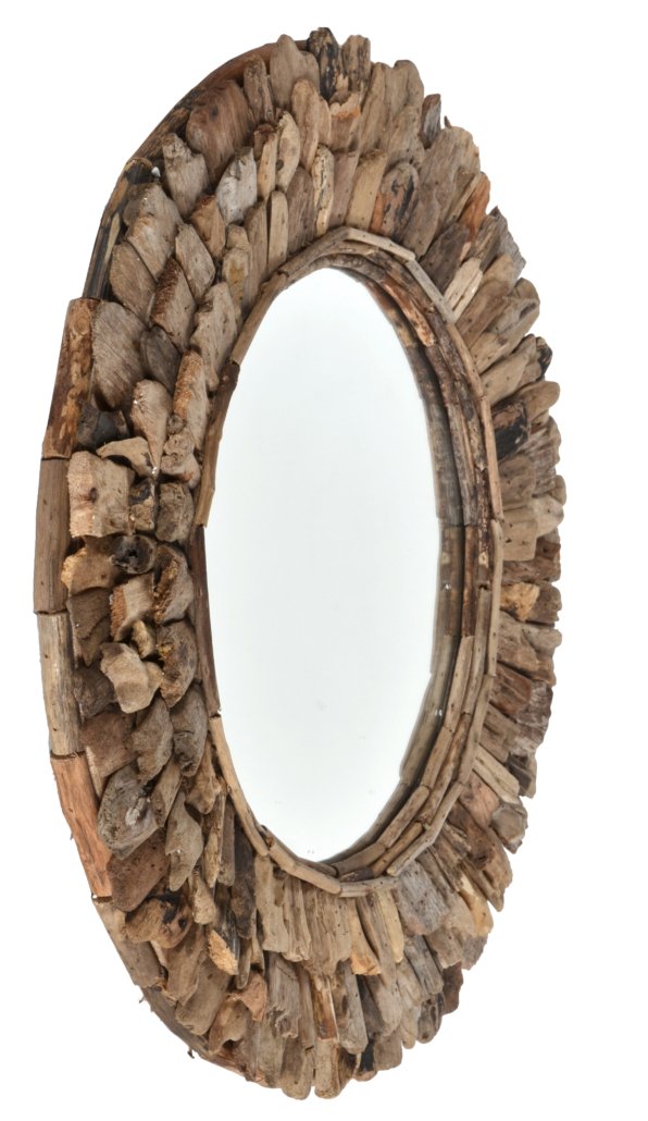 A hand made 24″ Large Diameter Wood Chuck Mirror. This natural wood mirror is created by hand by the local villagers from Indonesia exclusively for AFD Home Collection. One of the beautiful characteristics of the finished creation is the way the local artisans hand select and layer the uniquely shaped wood chucks creating the outer frame. If you are looking for Functional wall d?cor with rustic and even a primitive style to either accent or add contrast to your interior design, This small Wood Chuck Round Accent mirror may be the perfect size but for customers desiring a bigger mirror consider the Large Round Wood Chuck Mirror 120 Cm ( 48″ dia. ). No Assembly Required!