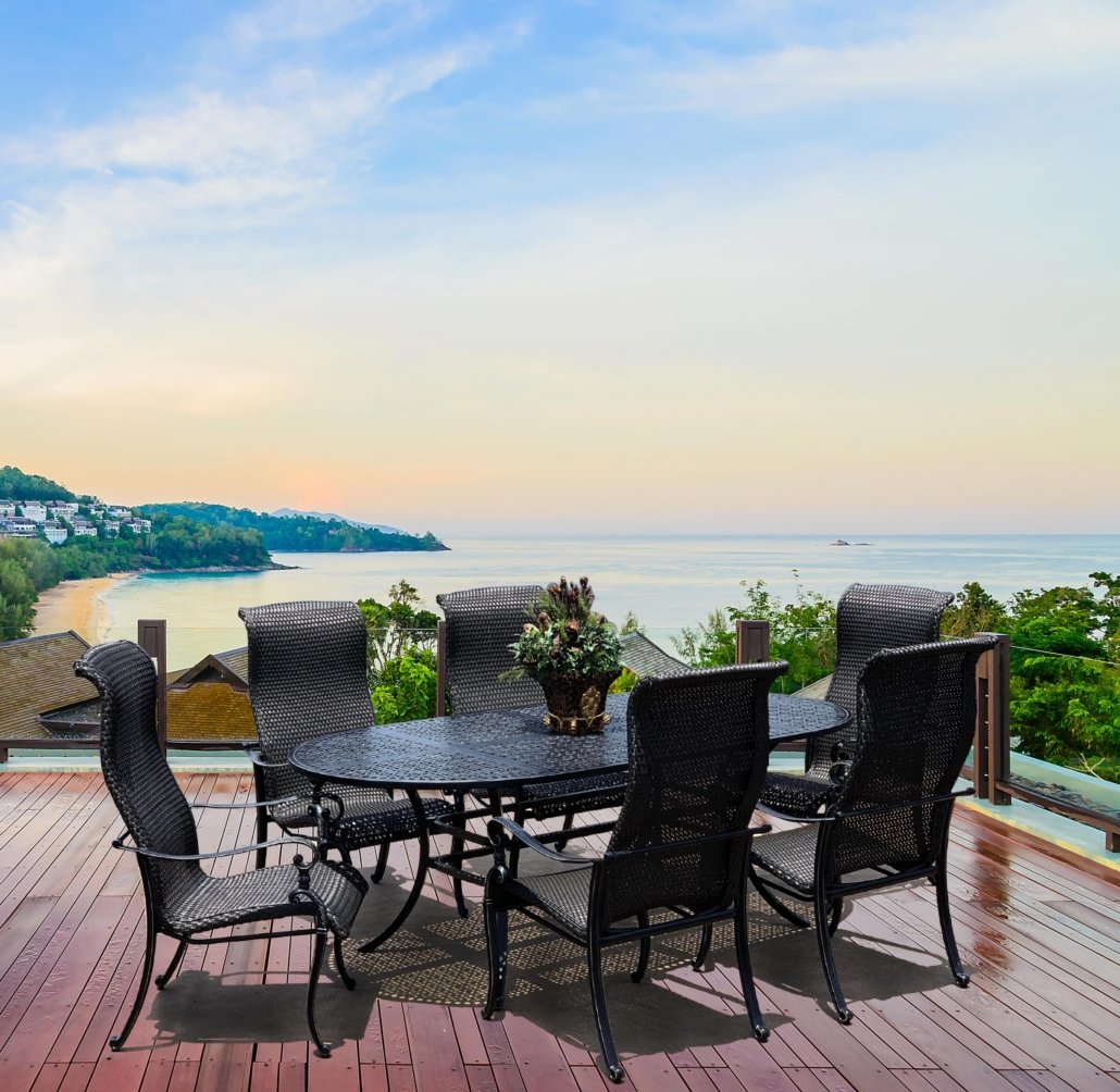 - Set includes 6 Wyndemere Dining Chairs and a Hand Cast Aluminum Oval Wyndemere Table