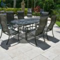 Bridgeton Moore Aluminum presents the Wyndemere Oval Dining 7 Piece Set, which includes 6 chairs and a large oval table from our new Wyndemere Collection. The designers placed a high standard on the finishing quality of this beautiful collection. The collection features a rich ebony black tone with hand applied soft silvery-white subtle dry brushed accents that accentuate the design elements before applying the multi-step powder coat finishing protection for longer lasting outdoor use. The set features 6 tall shapely contoured back arm chairs intricately woven in a unique pattern by hand in all-weather natural looking synthetic polyethylene wicker weave. The shape of the chair back is not only fashionable but offers very comfortable seating. The table and chairs also have unique insignia collection details as the top have an alluring symmetrical open design and the chair’s arms offer a stylish twist. The Wyndemere Oval Dining 7 Piece Set can be used standalone or pairs perfectly with the Wyndemere Chaises for a more complete back yard. The collection also offers a smaller table set and a casual seating fire pit club chair set, if desired. The chairs and table are cast in 100% aluminum and will never rust. The chairs are fully welded prior to finishing, you will never find screws used in a Bridgeton Moore Aluminum Seat and no assembly is required, the table requires light assembly. Set Sku : 11267860 Set of 7 Includes: Sku: 11266648 Windermere High Back Dining Chair Qty 6 26.50 x 31.25 x 44.75 Sku: 11266613 Windermere 52 Round Table” Qty 1 52 x 52 x 25.25 Constructed using todays Best in Class manufacturing techniques, Bridgeton Moore has established high brand quality standards and offers one of the best warranties in the Industry, 3 years on all frames and finish under normal conditions, fabrics are all Sumbrella grade and come with a manufacturers supplied two years against any manufacturing defects and or fading from date of purchase. Note * All products used outdoors require reasonable care and that level of care depends on varying external conditions. Covers are recommended for year round outdoor exposure and especially for all coastal applications. Extended exposure in coastal areas can cause corrosion and while this product is used in many coastal applications, they are voided from warranty. Simple hosing down or rinsing off salt exposure if/any will protect and extend the beautiful finish. Table Assembly Required.