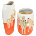 Zebra White Gold and Orange Vases set of 2 is a fresh new offering. Graduated in shapes and height for a more interesting larger display. Hand Cast in Porcelain. The artists hand finish the vase with an interesting Zebra design. Strong contrast is archdeceiver with the colorful Orange white and gold plating in this popular new finish. Often ordered in pairs for balance. No Assembly Required!