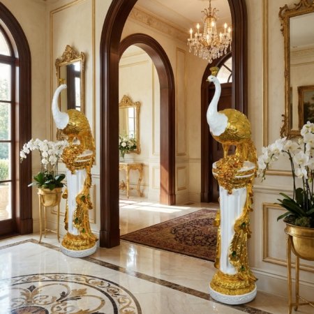 Large Golden Emerald Peacocks on Pedestal Set of 2